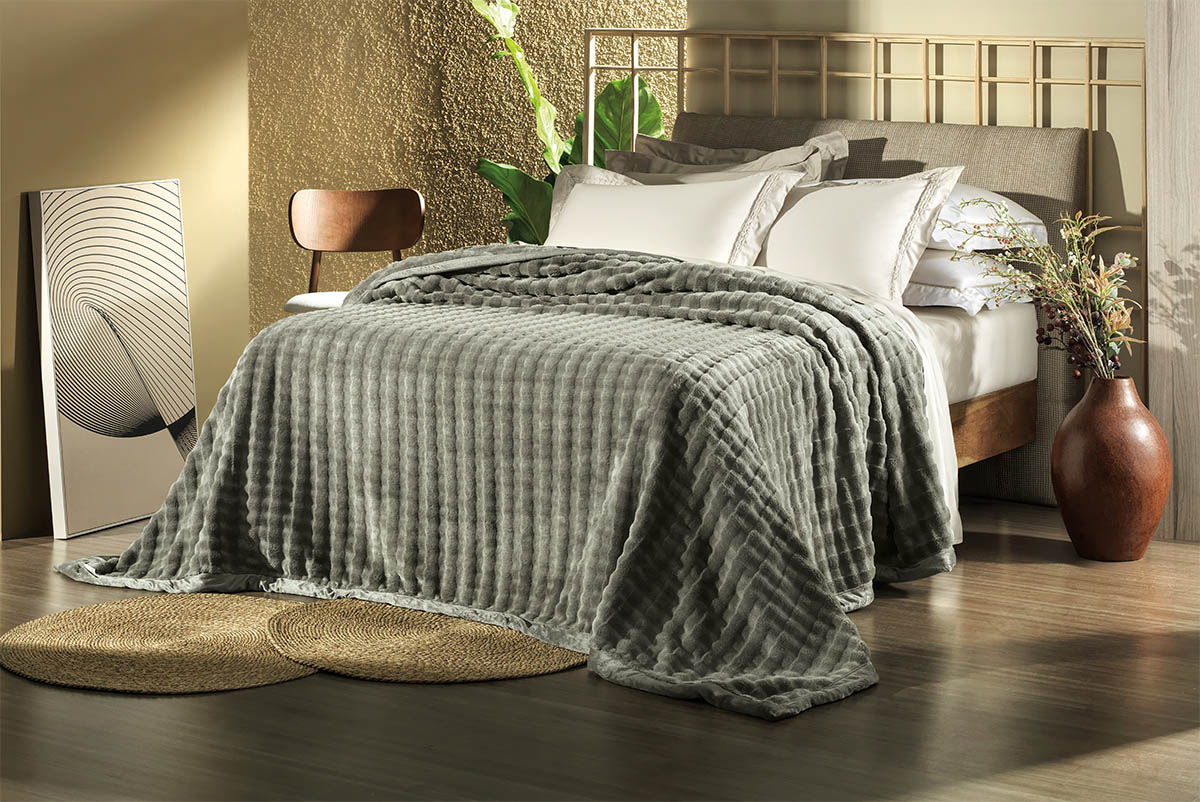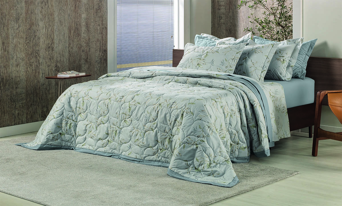 Compondo a cama, a estampa Ágape encontra o Cobertor Desert Verde Seiva, criando uma atmosfera sensorial alinhada à uma das maiores tendencias de 2026: verdes terrosos. Ágape traz um floral leve em azul e bege sobre fundo cinza, em percal 200 fios, com peças dupla face e enchimentos que garantem conforto. O Cobertor Desert, em plush premium com relevo geométrico, adiciona profundidade e modernidade. Juntos, criam uma composição elegante e acolhedora que equilibra textura, cor e aconchego.