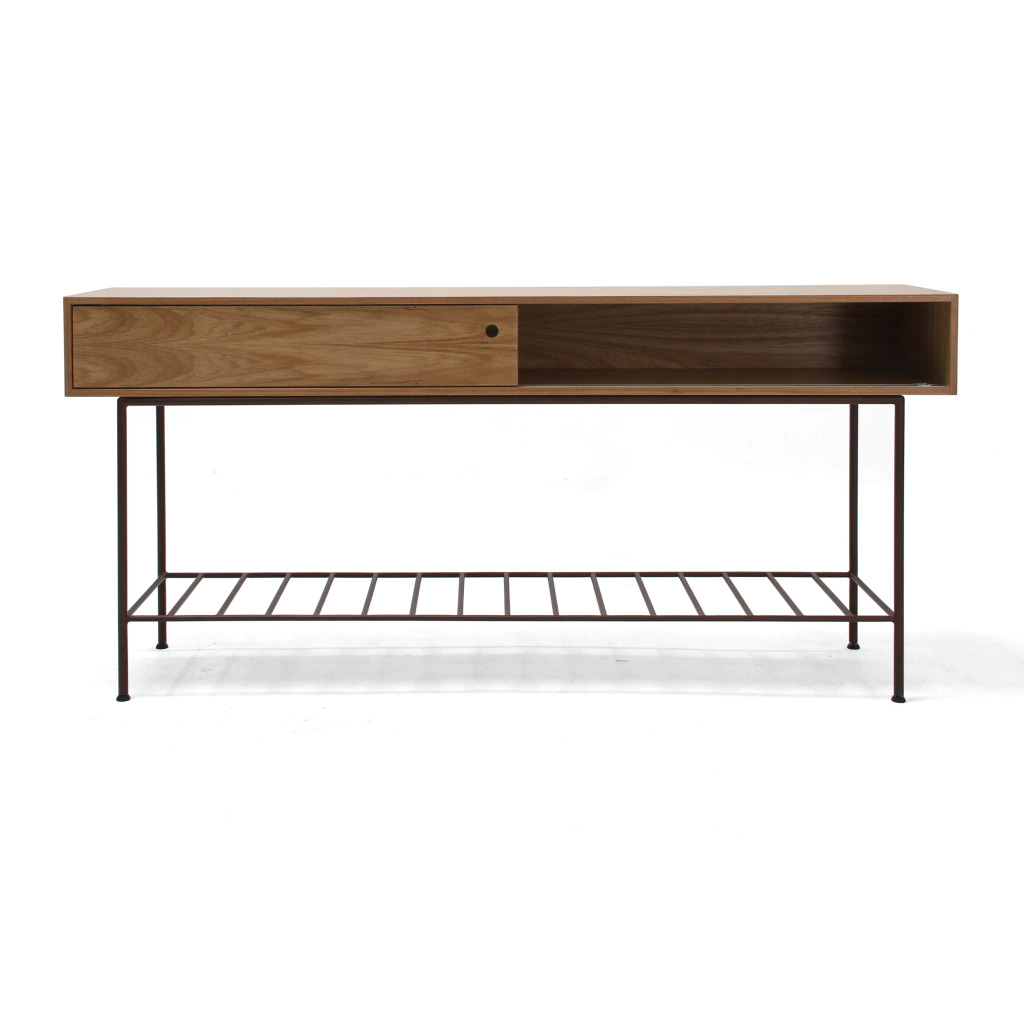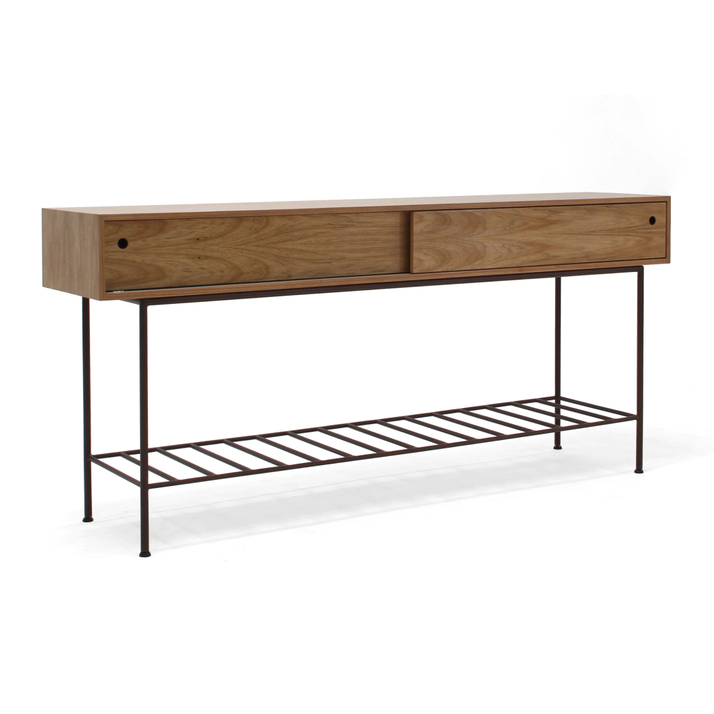 - ResumoAparador M&F com Prateleira, feito em aço carbono e madeira freijó. A peça oferece design sofisticado e funcionalidade, com acabamento em pintura eletrostática. Conta com duas portas e uma grade de aço na parte inferior, proporcionando amplo armazenamento e suporte adicional.