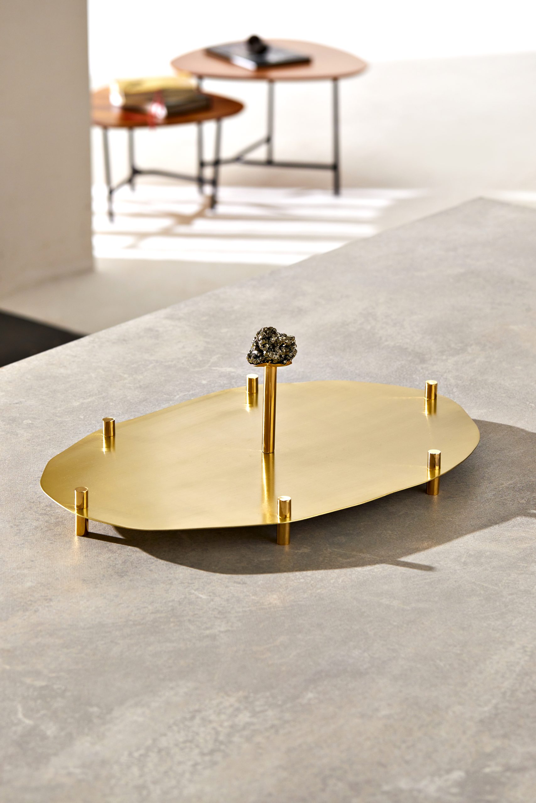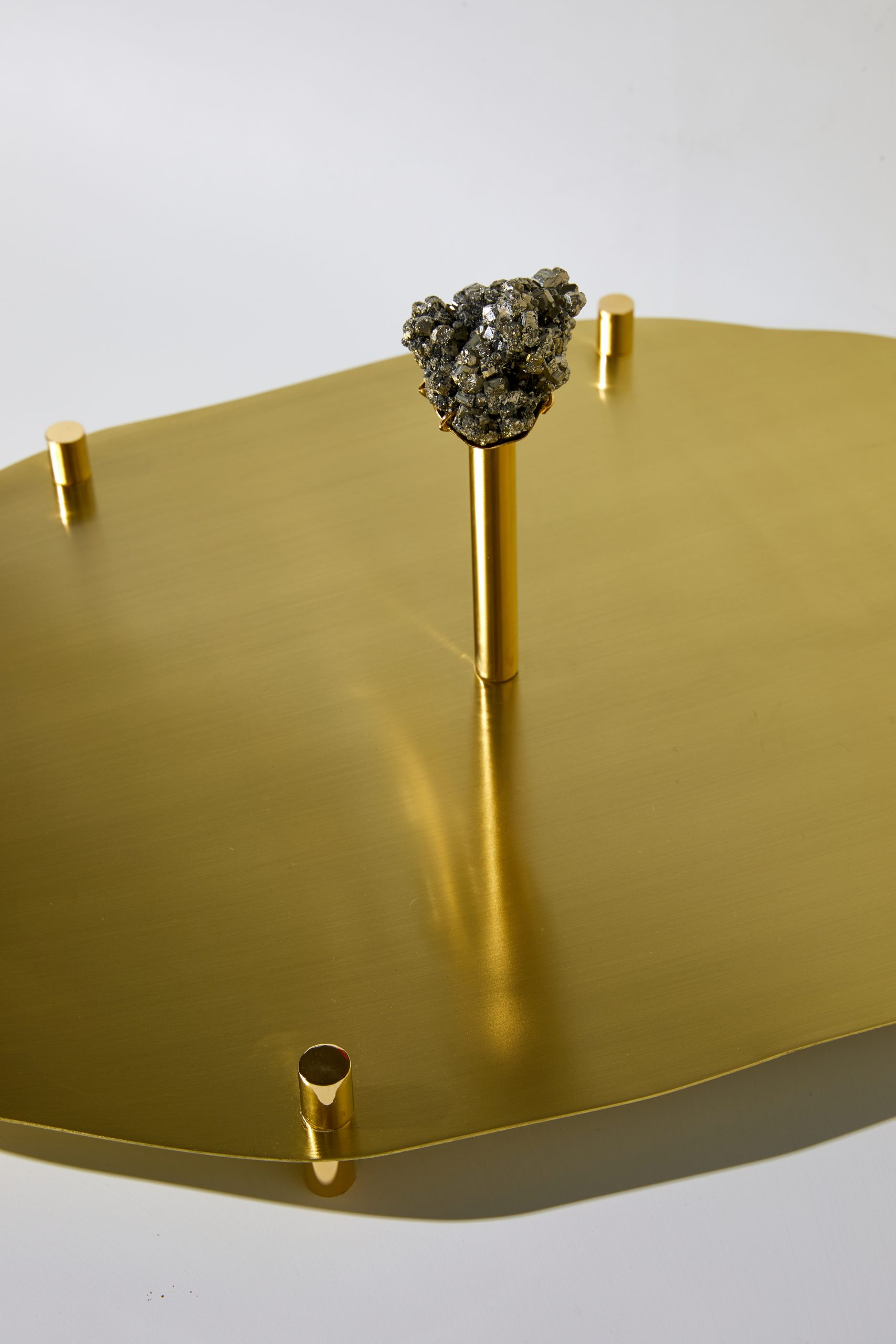 Cada bandeja é feita em latão escovado banhado a ouro recebendo sobre um pilar central uma pedra preciosa.