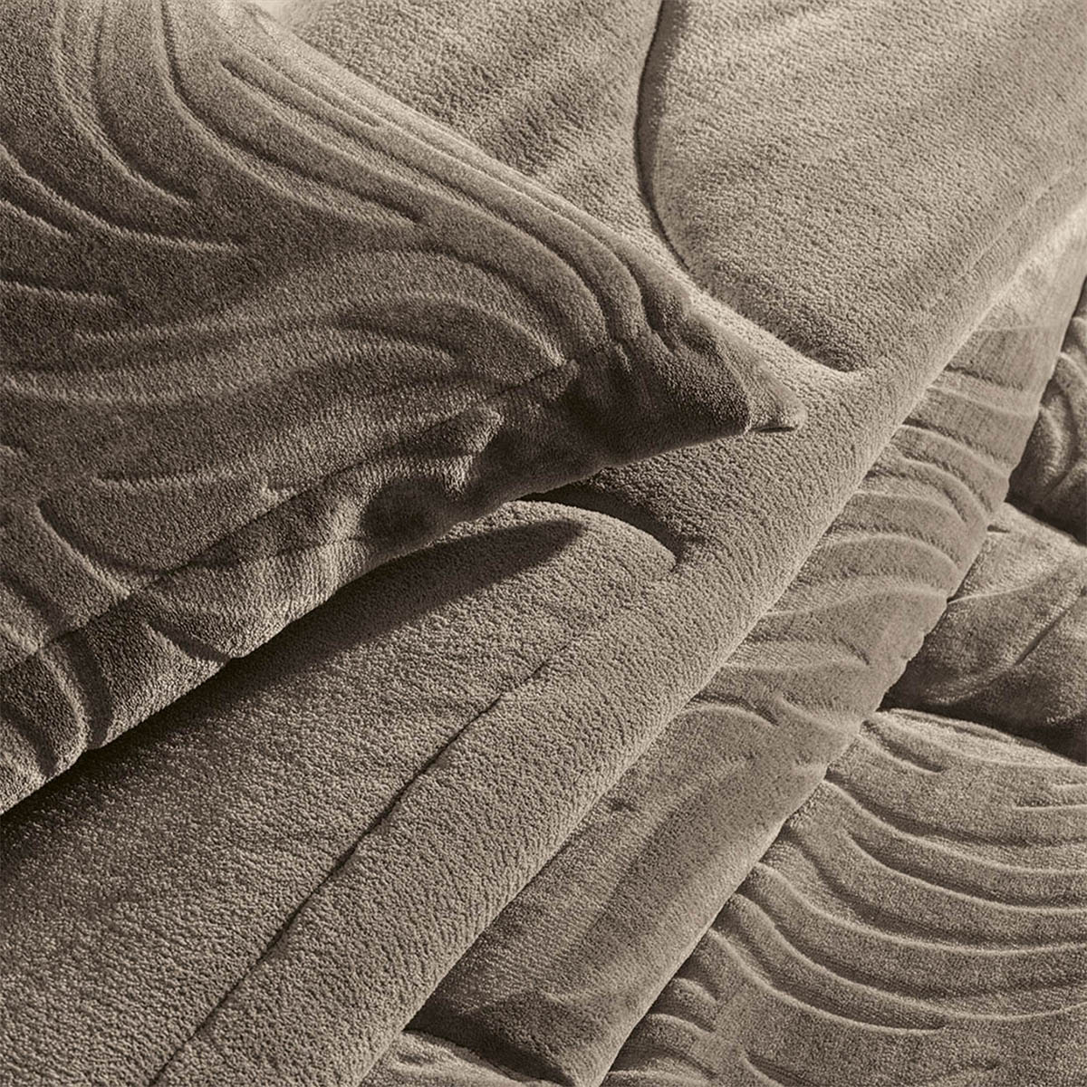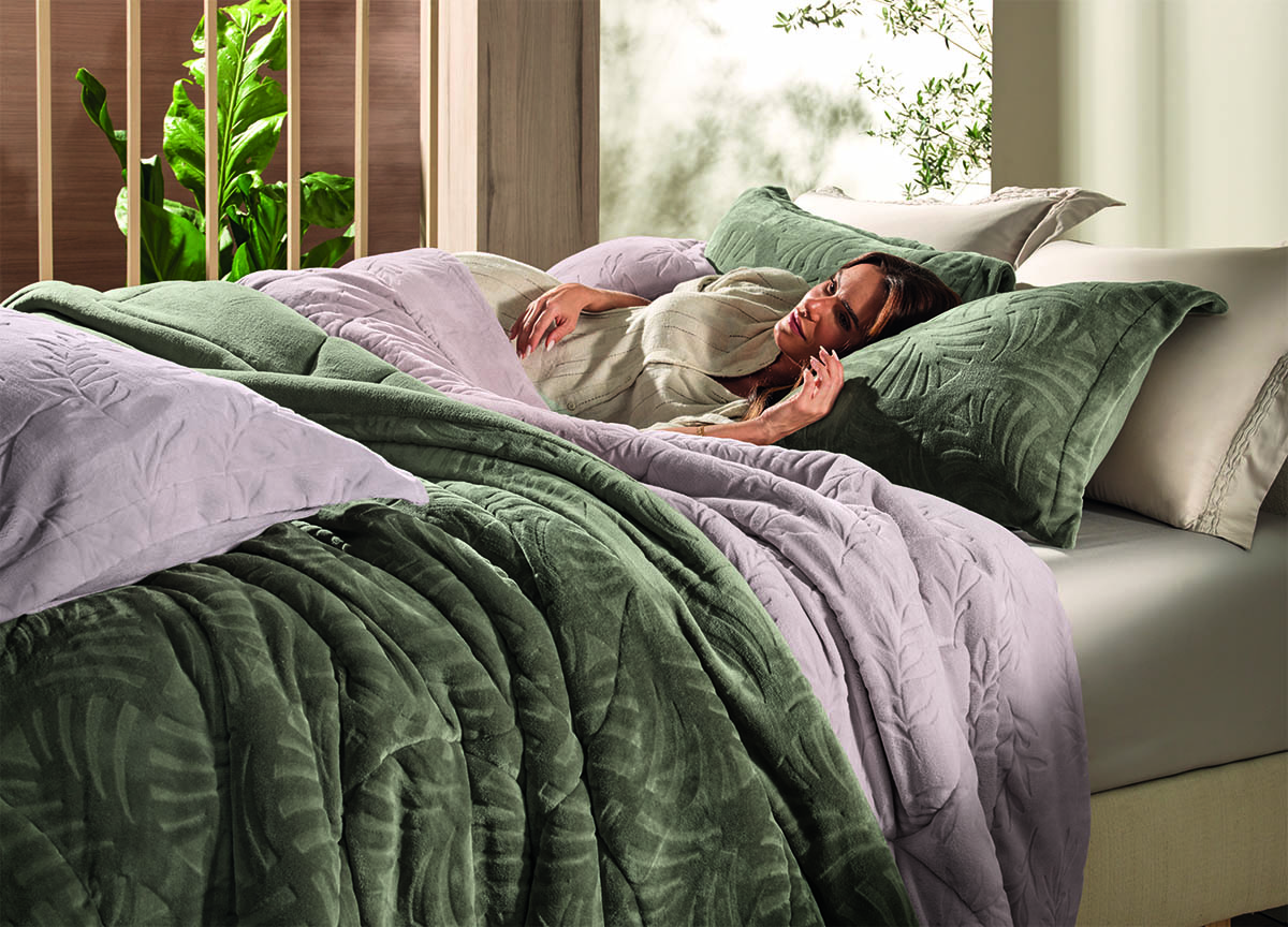 Na coleção Blend Elegance, o Edredom e as fronhas Aira se destacam pelas curvas orgânicas em relevo no plush premium, que adicionam profundidade e sofisticação. Com toque macio, aquecimento uniforme e brilho suave, o conjunto oferece conforto ideal para noites frias. Na cor Marrom Sândalo, reforça a elegância natural da linha, unindo textura e aconchego em composições equilibradas.