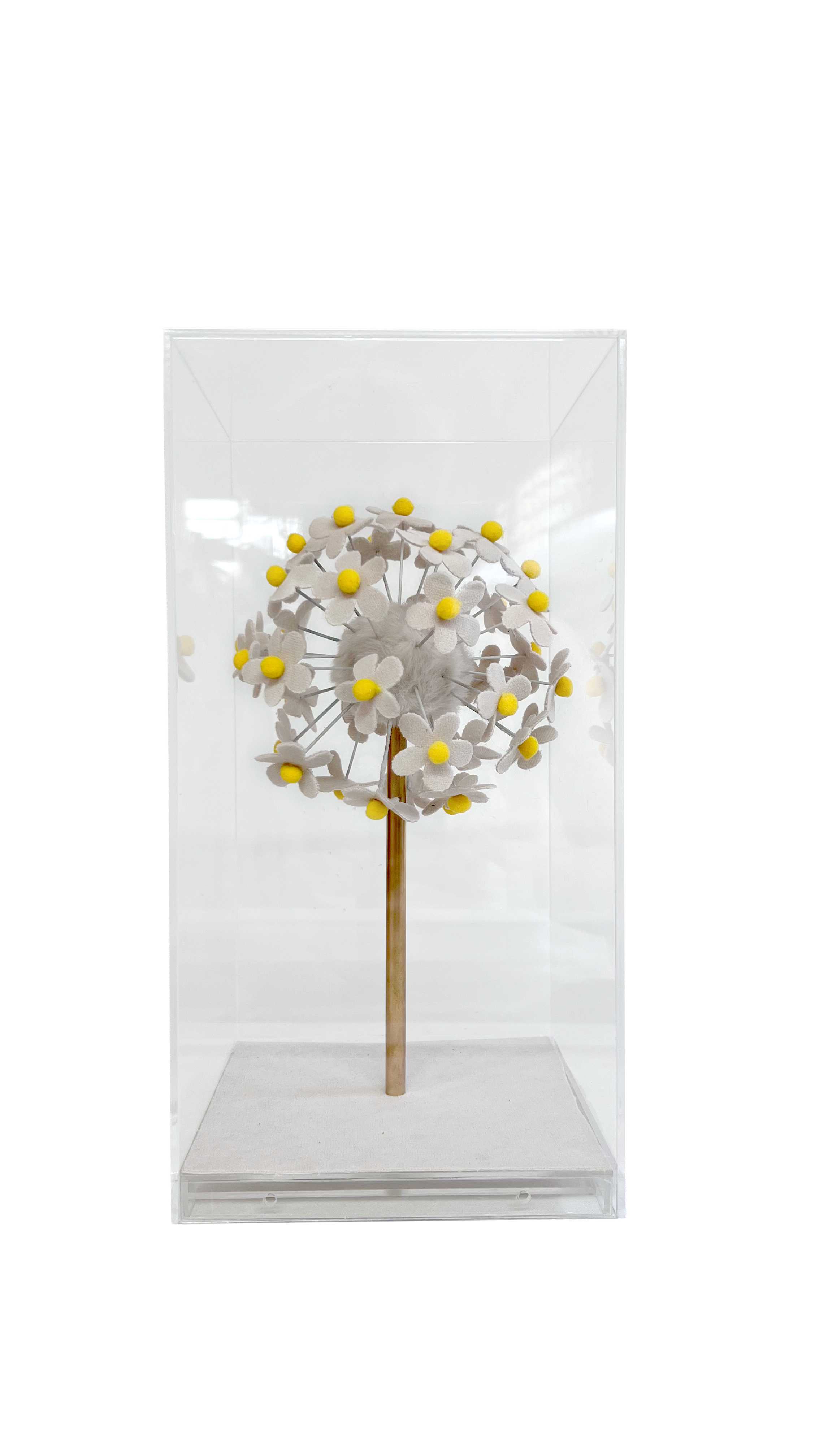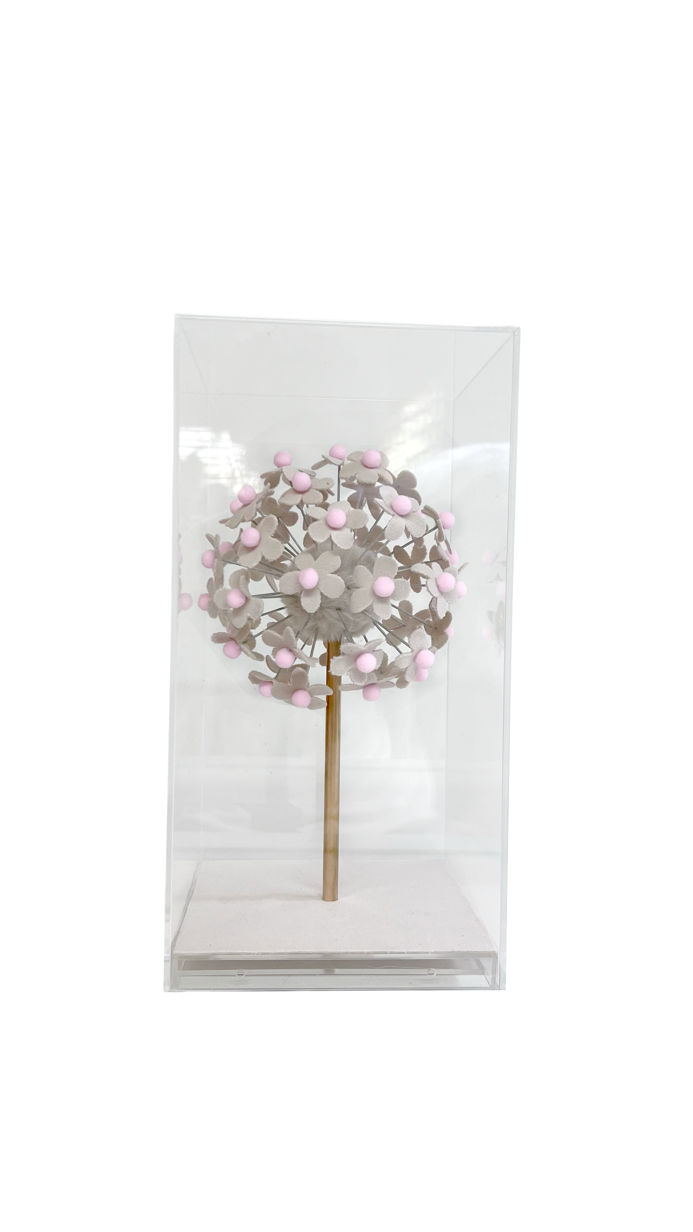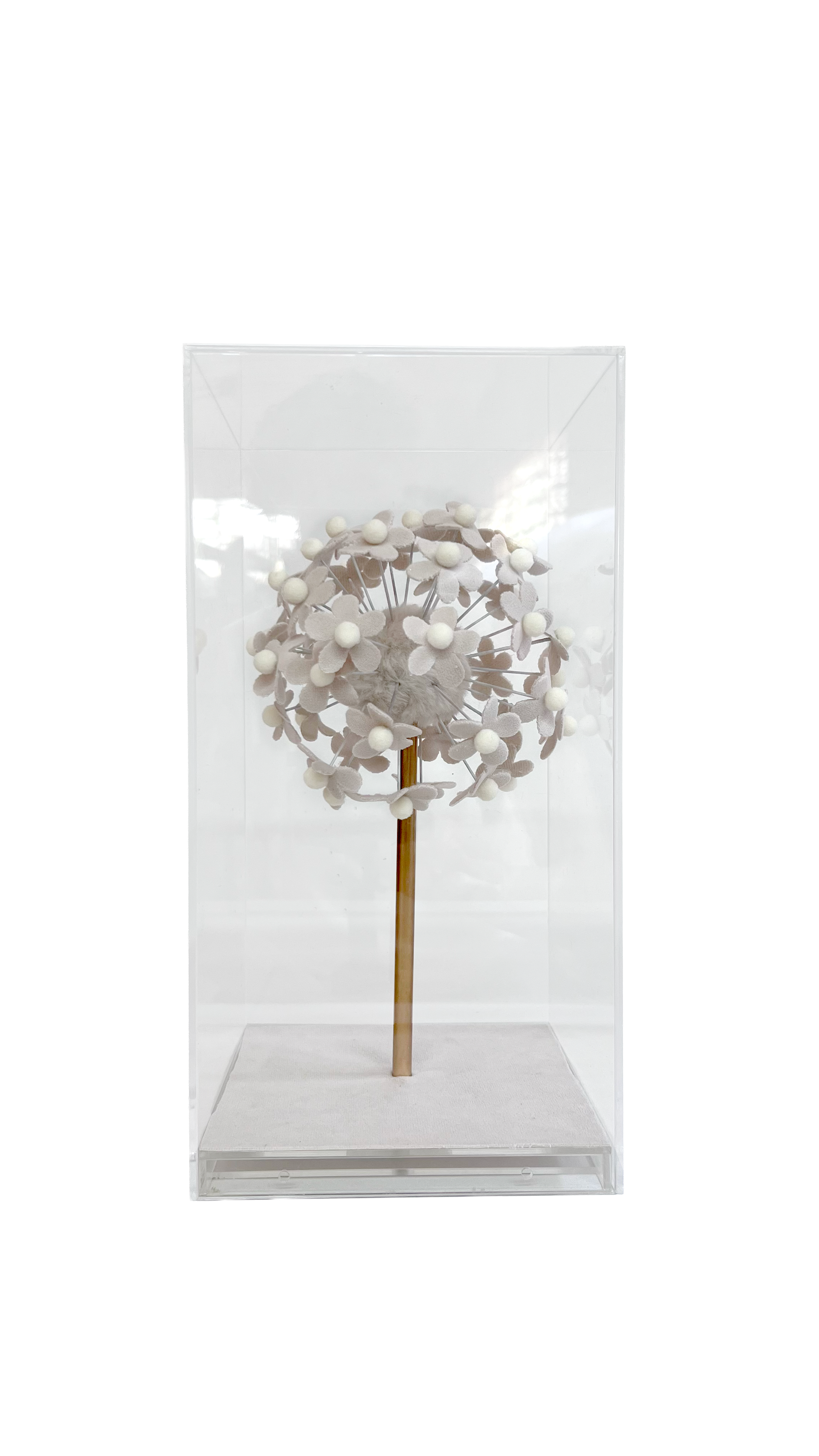 Uma flor em veludo protegida por acrílico, como um pequeno jardim em suspensão. A peça convida à observação do detalhe e da textura.Perfeita para mesas de centro, escritórios ou estantes, funcionando como objeto de contemplação e pausa visual.