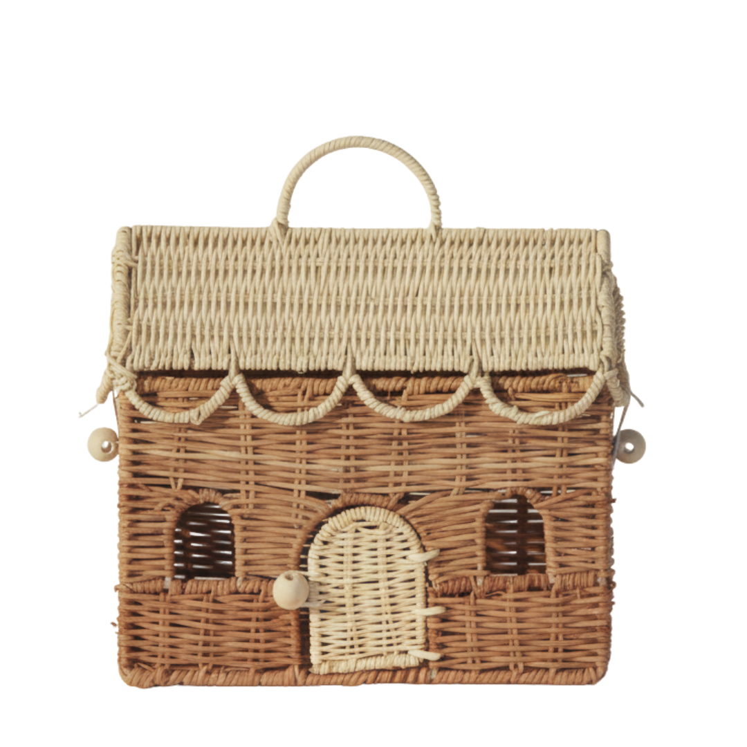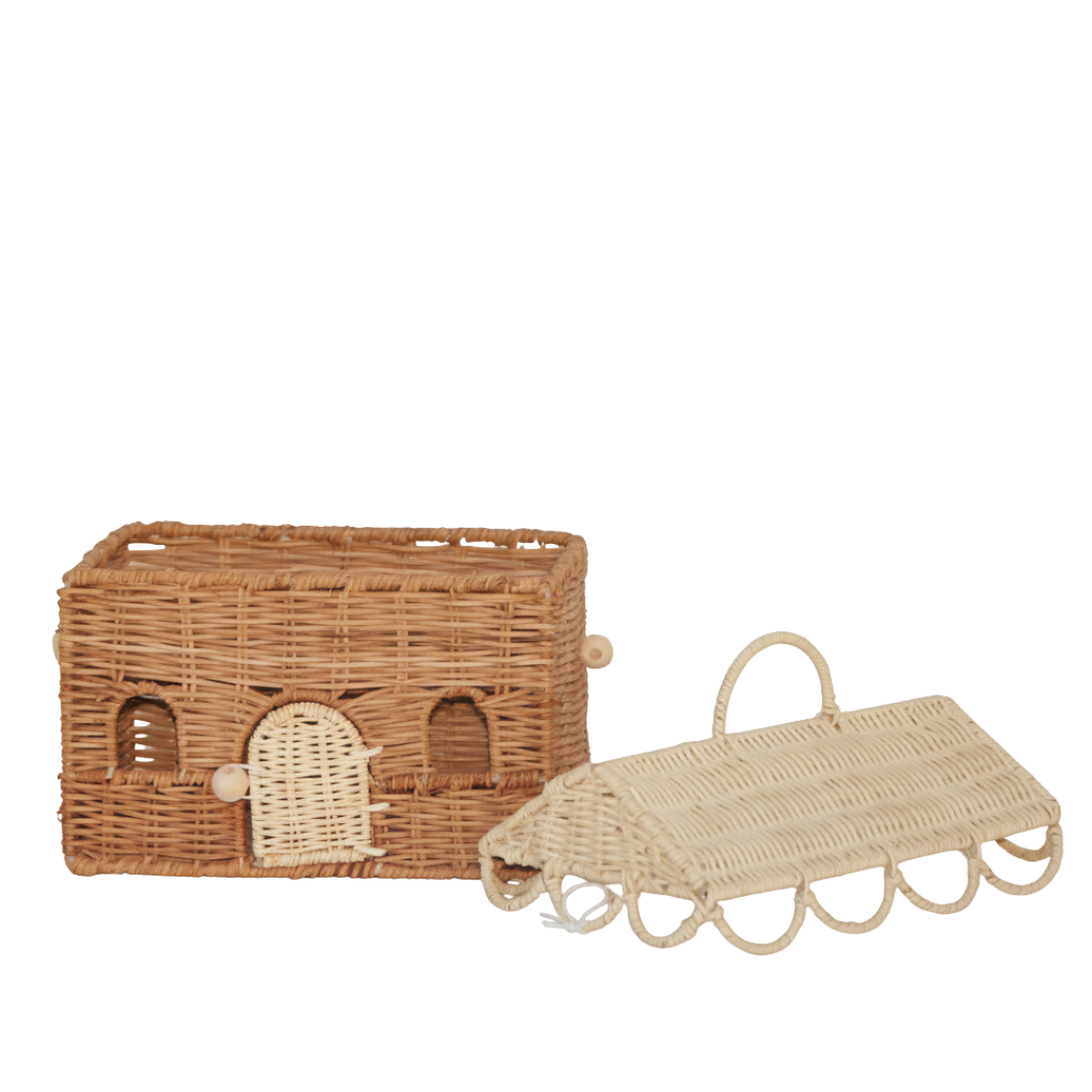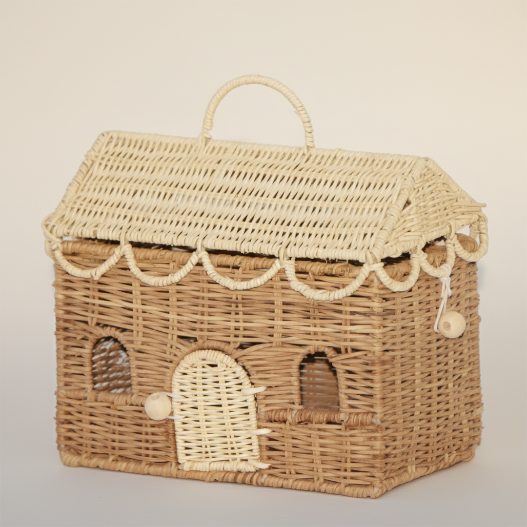 - ResumoCesto organizador em formato de casinha, confeccionado em rattan, disponível em duas cores.