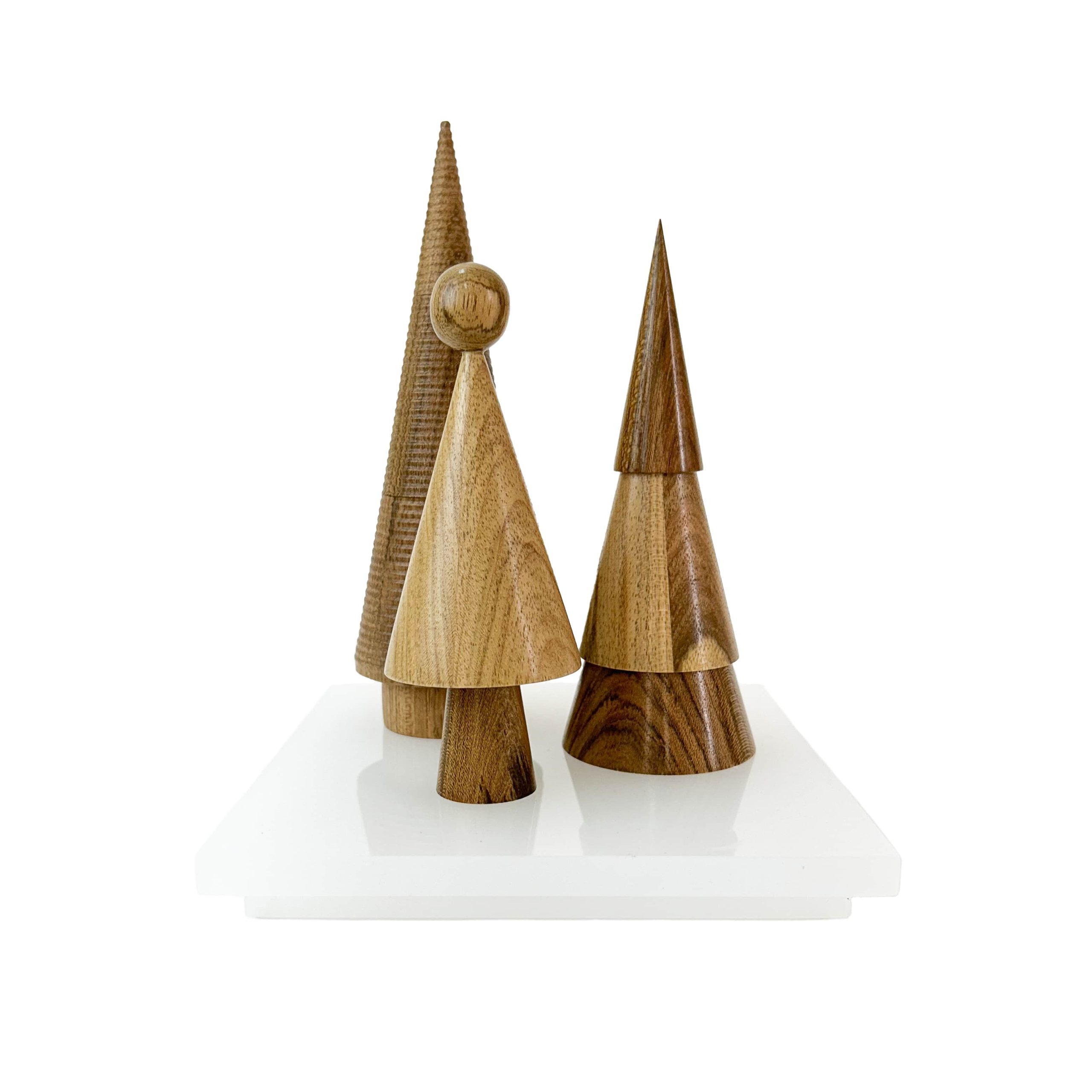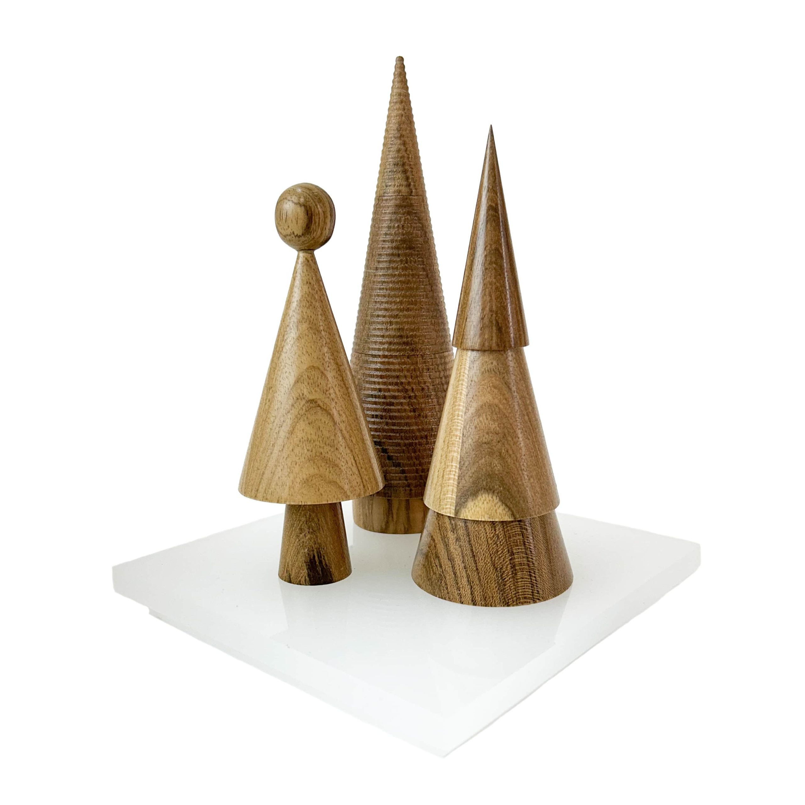 O Christmas Tree em Freijó é uma releitura contemporânea e atemporal da árvore de Natal, transformada em objeto de design. Esculpidas em madeira natural, as peças revelam veios marcantes, texturas orgânicas e variações de tonalidade que aquecem o ambiente e reforçam a autenticidade do material.