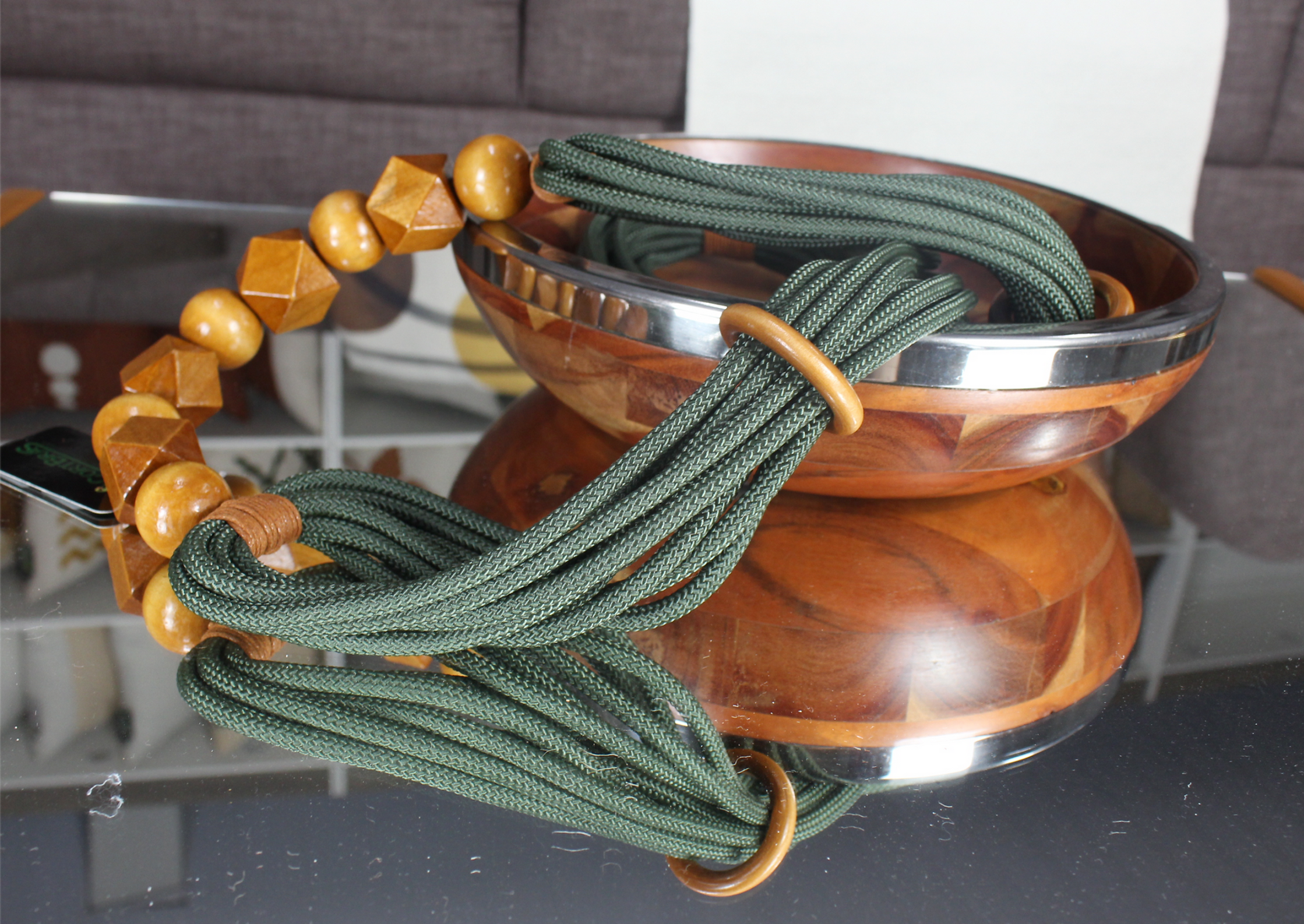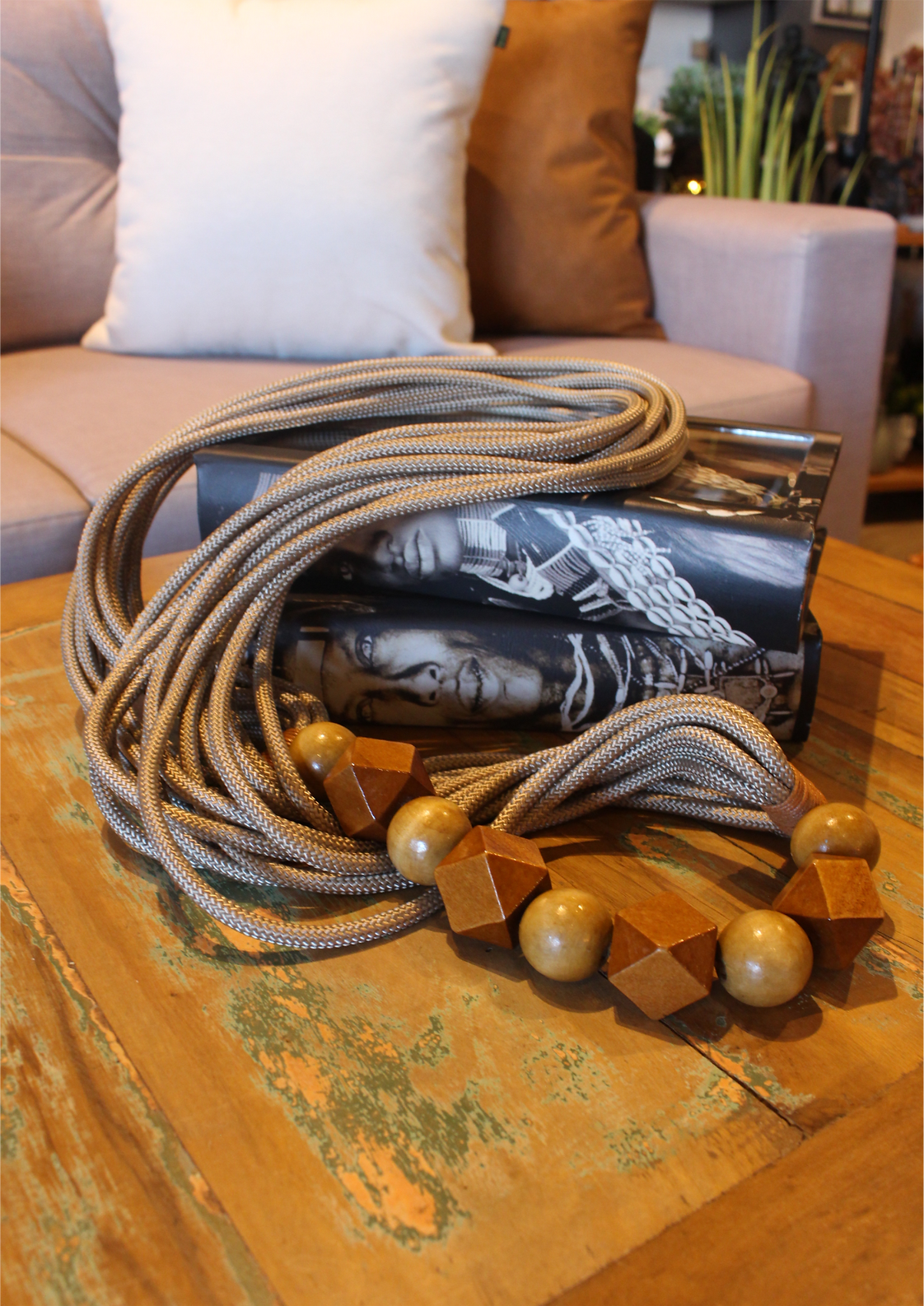 Produzido em materiais como madeira, cordas e peças em acrílico, ele pode ser utilizado sobre mesas de centro, aparadores, bandejas ou até mesmo em composições com livros e vasos.