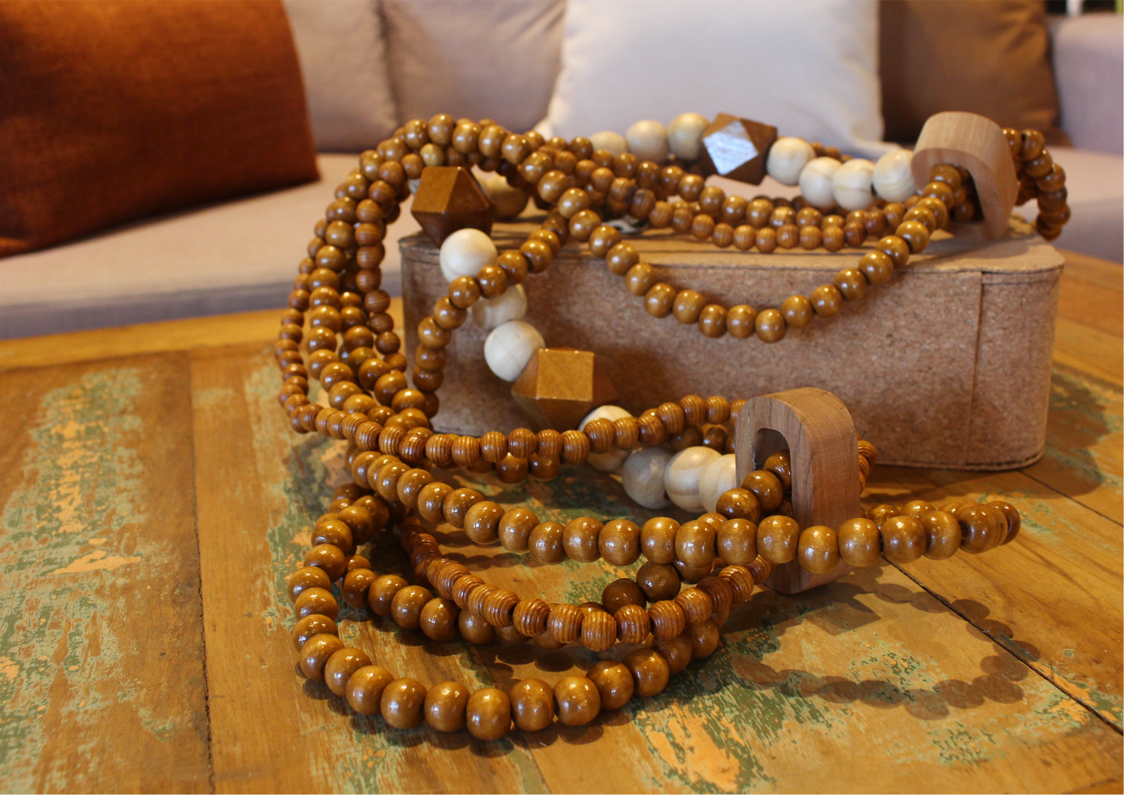 Produzido em materiais como madeira, cordas e peças em acrílico, ele pode ser utilizado sobre mesas de centro, aparadores, bandejas ou até mesmo em composições com livros e vasos.
