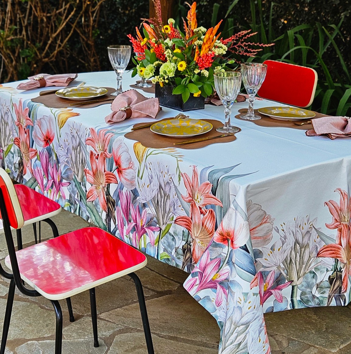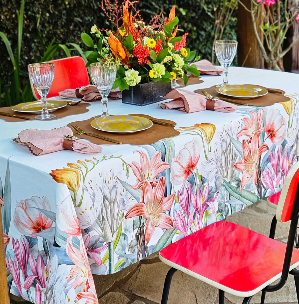 As toalhas de mesa em tecido da Aurora Decor são feitas por encomenda, de acordo com o tamanho escolhido. Elas têm desenho exclusivo, feitos de forma autoral. Assim que os desenhos são finalizados, são enviados para nossa estamparia parceira, estampados em tecido branco, e seguem para corte e costura. Utilizamos nas toalhas de mesa a sarja com resistência a líquidos, um tecido que carrega a praticidade, pois ao cair líquidos, basta usar um guardanapo de papel ou tecido para remover rapidamente o líquido, e a elegância, em função do caimento perfeito. O acabamento de nossos produtos é também um diferencial, pois zelamos pelo cuidado na sua finalização. O acabamento é feito em canto mitrado, promovendo elegância e durabilidade à peça. Além, claro, do nosso cheirinho, que também é exclusivo e acompanha cada caixinha que sai da Aurora Decor para sua casa. Exclusividade do começo ao fim do processo, para levar algo único para você 🙂