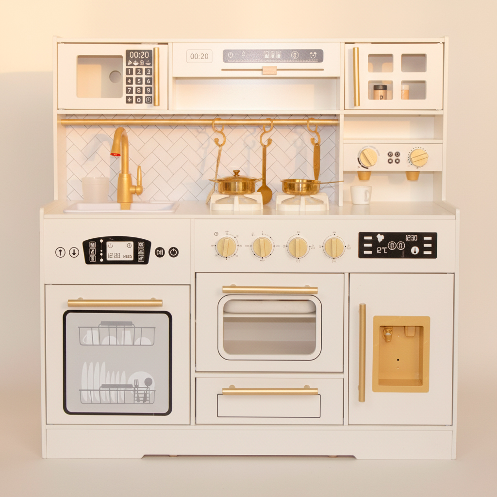 Acessórios pet > Brinquedos e acessórios COZINHA FUNCIONAL E ACESSORIOS COM DETALHES EM BRANCO E DOURADO