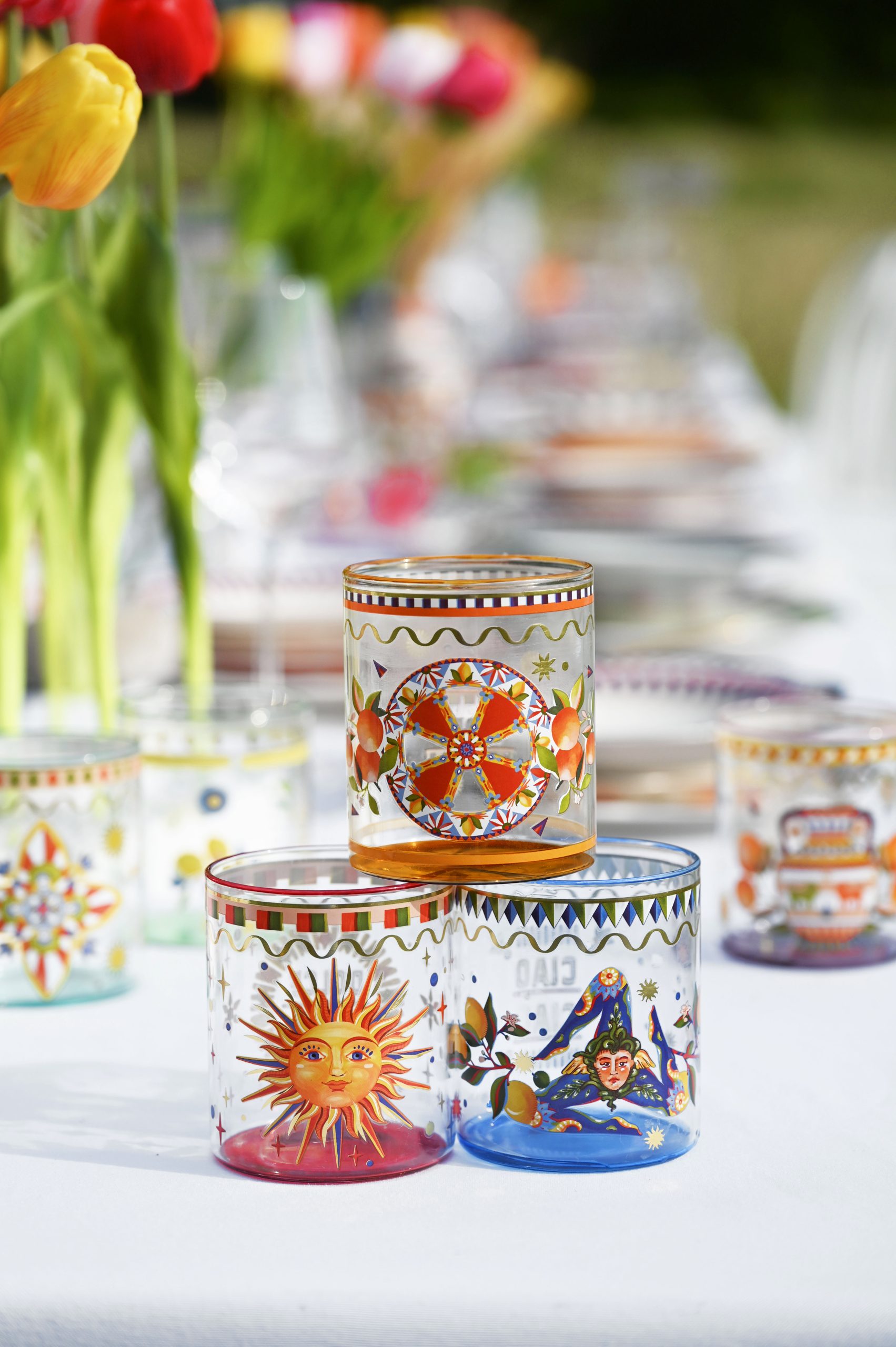 • ResumoConjunto de copos em vidro transparente com base colorida e estampas vibrantes de inspiração mediterrânea. Os grafismos solares, motivos geométricos e elementos clássicos criam uma composição alegre e sofisticada, ideal para levar cor, personalidade e leveza à mesa.