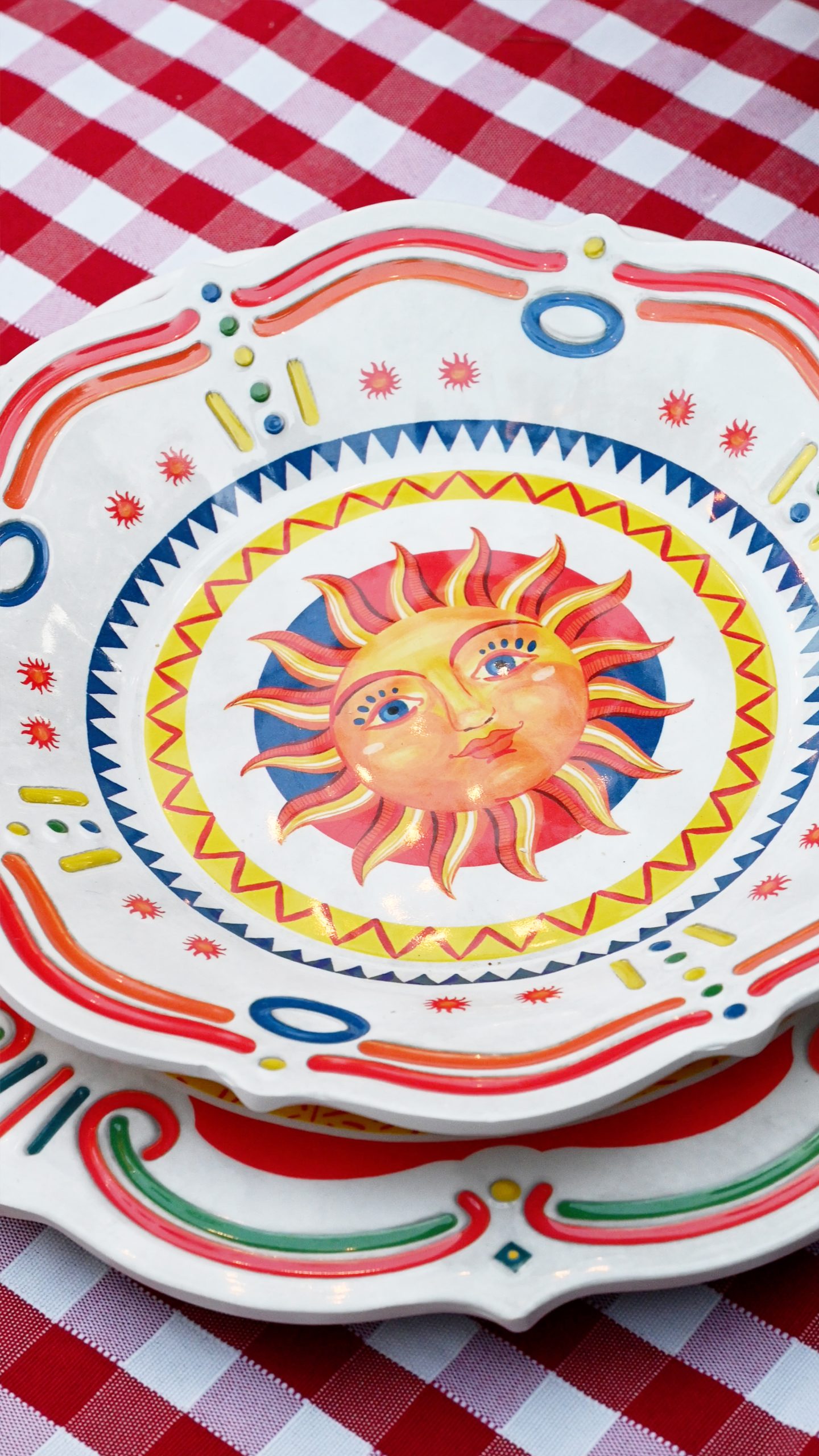 - ResumoPrato fundo em melamina com estampa central de sol radiante em tons de amarelo e laranja. A borda é decorada com arabescos e formas geométricas em vermelho, azul e detalhes amarelos, transmitindo energia e vivacidade.