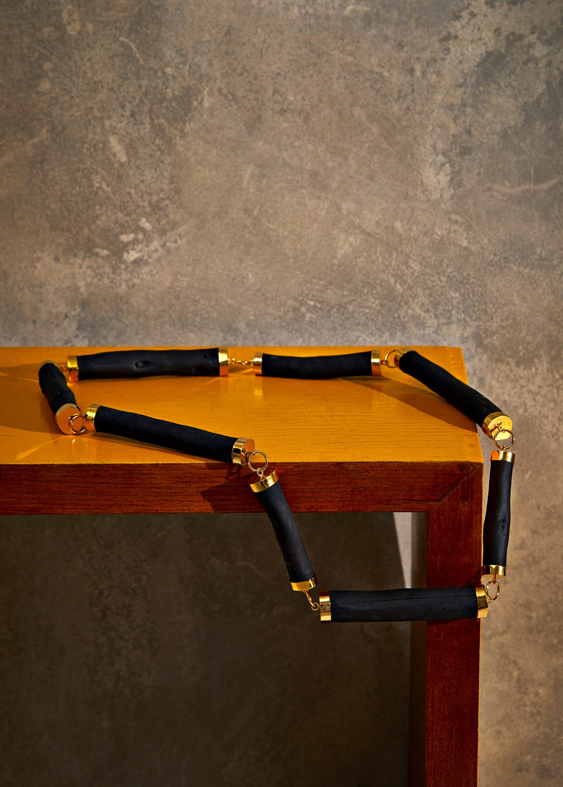 Os galhos de araucária caídos naturalmente evidenciam o caráter único dos nossos sistemas naturais e são submetidos à técnica tradicional japonesa shou sugi ban. Nela, a madeira é preservada por carbonização superficial, que revela histórias e cicatrizes marcadas em cada galho, além de resgatar a ascendência nipônica de Nao Yuasa.
