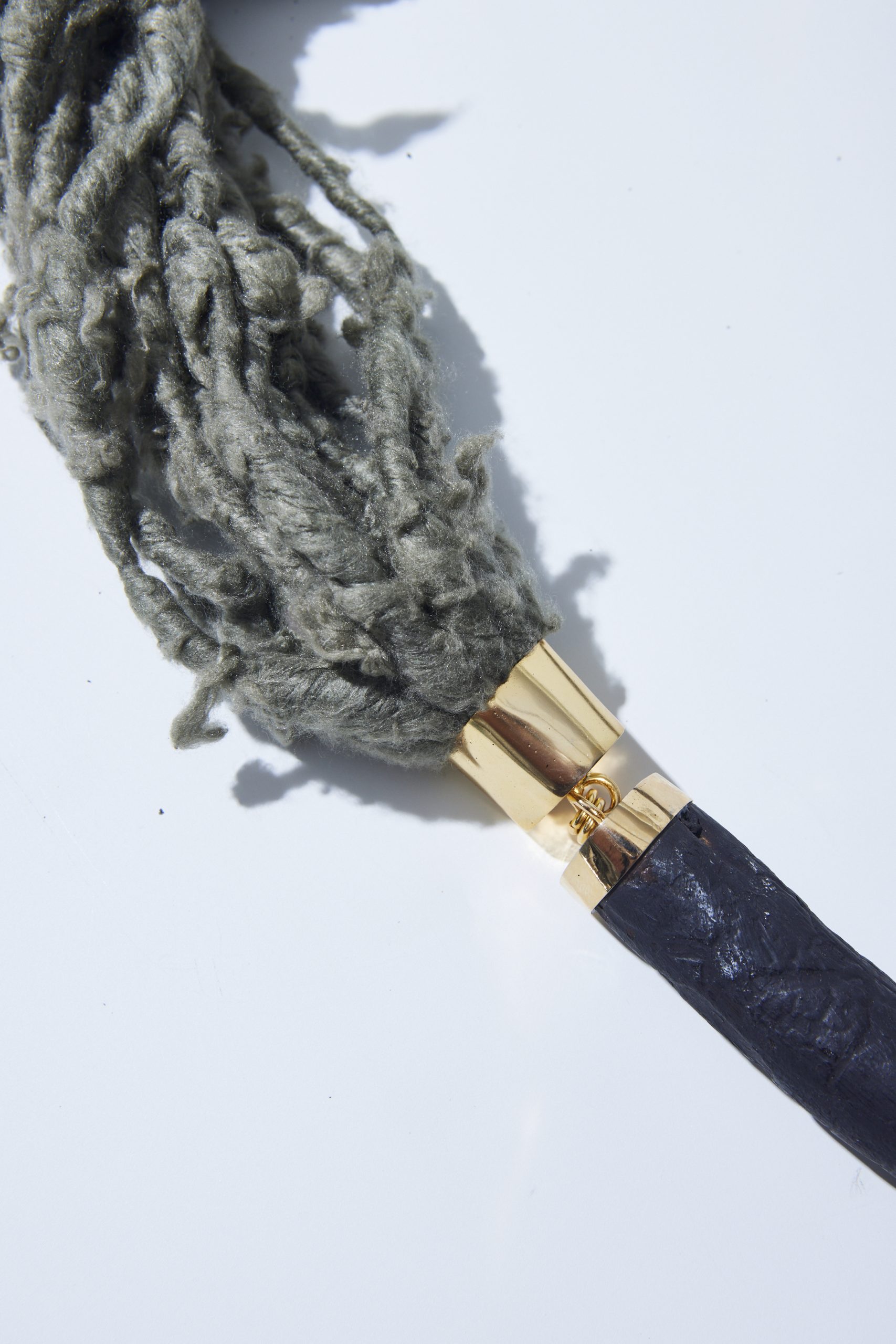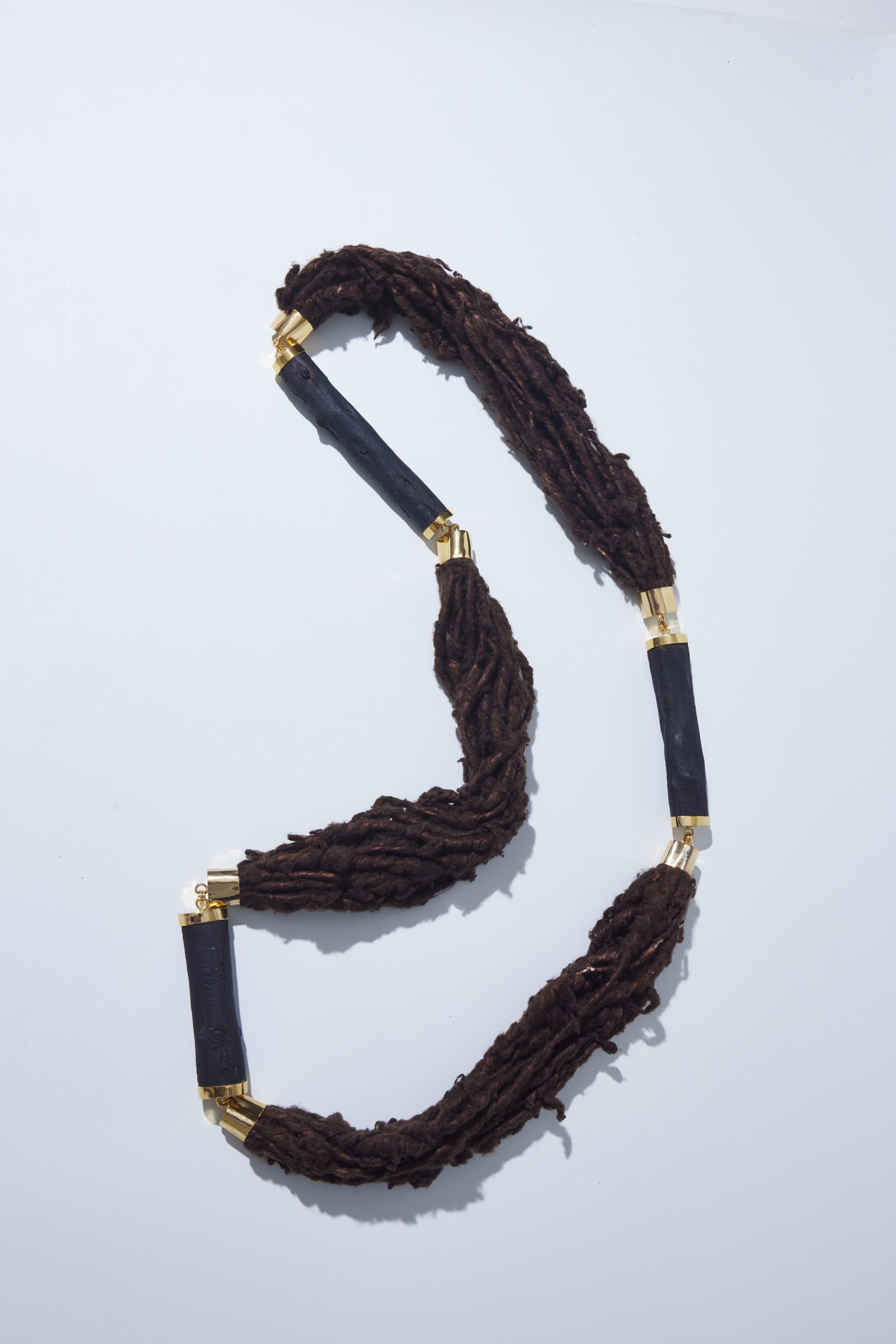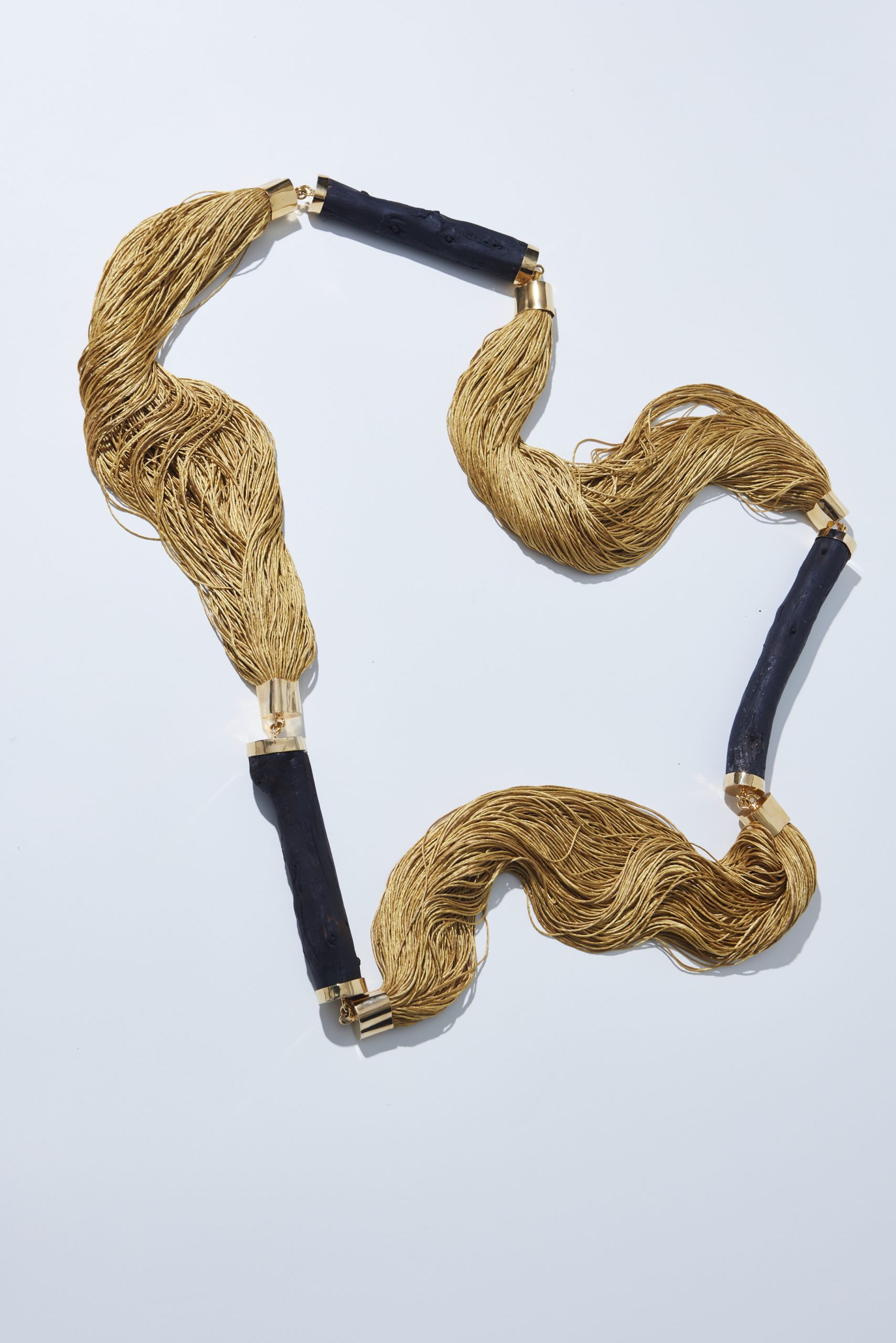 Na Coleção Floresta, fios em 100% seda tingida naturalmente se conectam aos galhos de araucária, carbonizados pela técnica tradicional japonesa de preservação da madeira, shou sugi ban. Acabamento em metal banhado a ouro a partir de técnicas de joalheria.