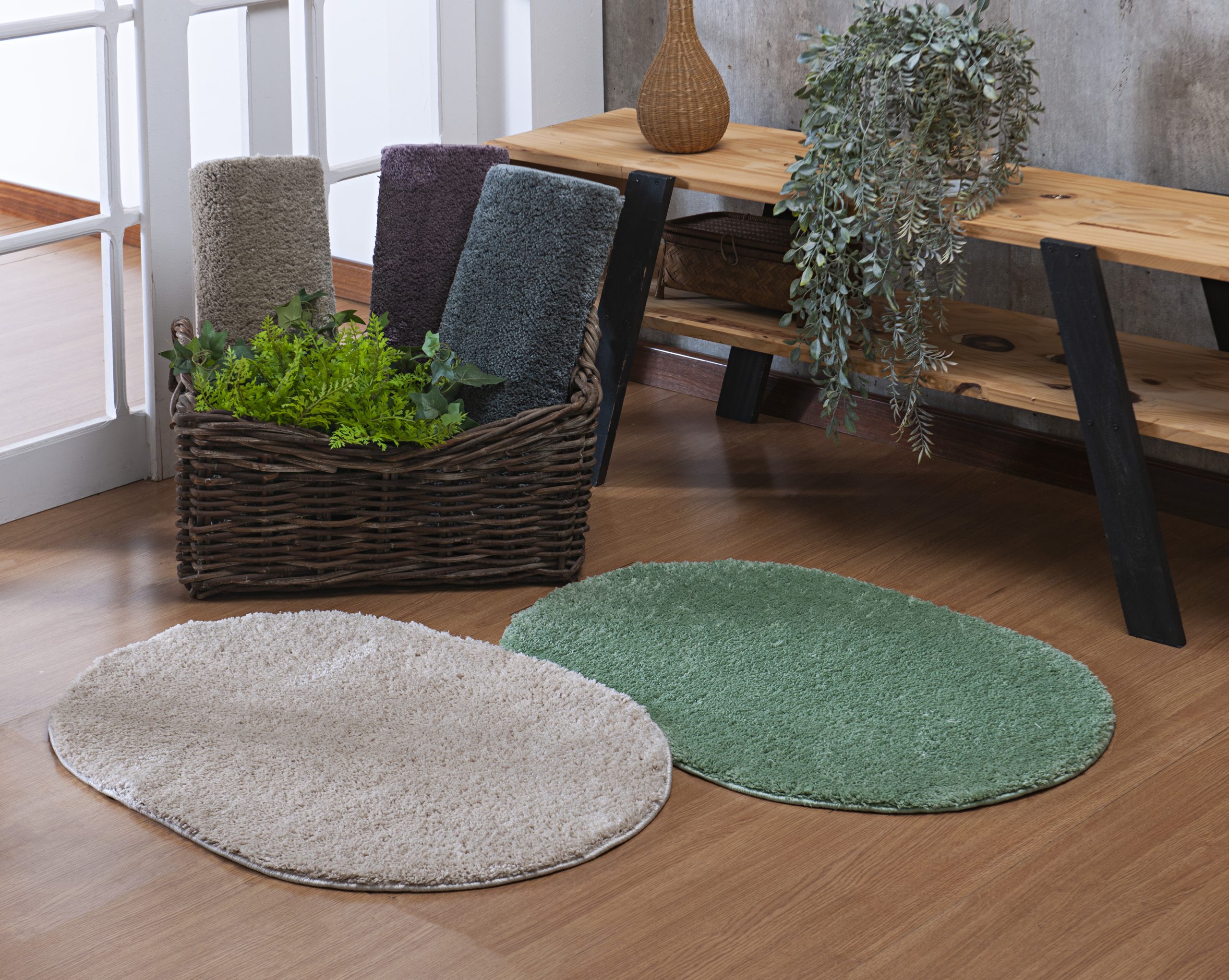 - ResumoTapete Oval/ Banheiro em poliester com fios retorcidos, pelo cortado. Altura: 17mm.
