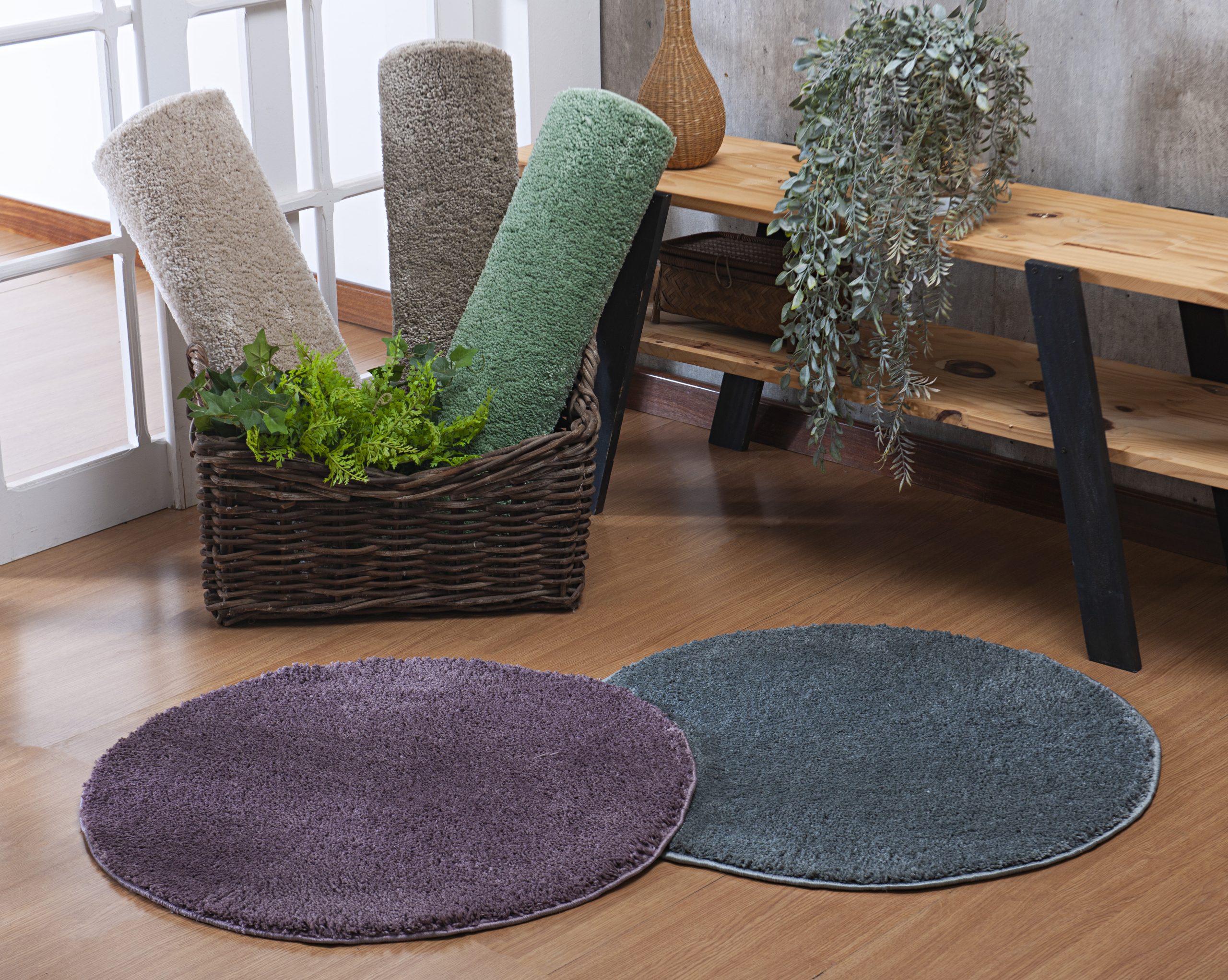 - ResumoTapete Redondo/ Banheiro em poliéster com fios retorcidos, pelo cortado. Altura: 17mm.