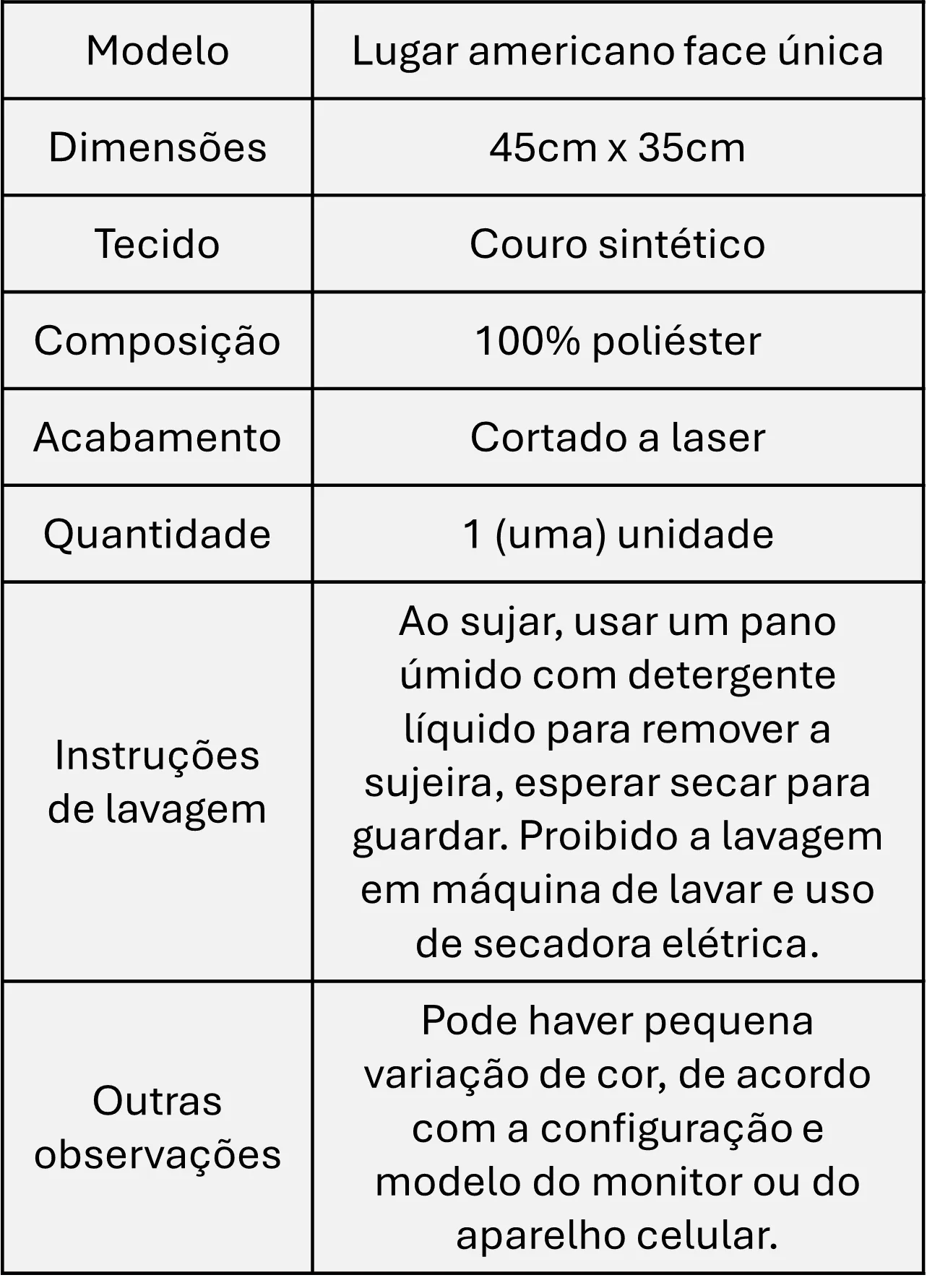 O lugar americano, produzido em couro ecológico é um enxoval para a vida toda. Promove a praticidade do dia a dia, pois é de fácil manutenção, limpeza e armazenamento. É cortado a laser, com a cauterização do fio do tecido, oferecendo uma durabilidade maior à peça, pois não desfia.