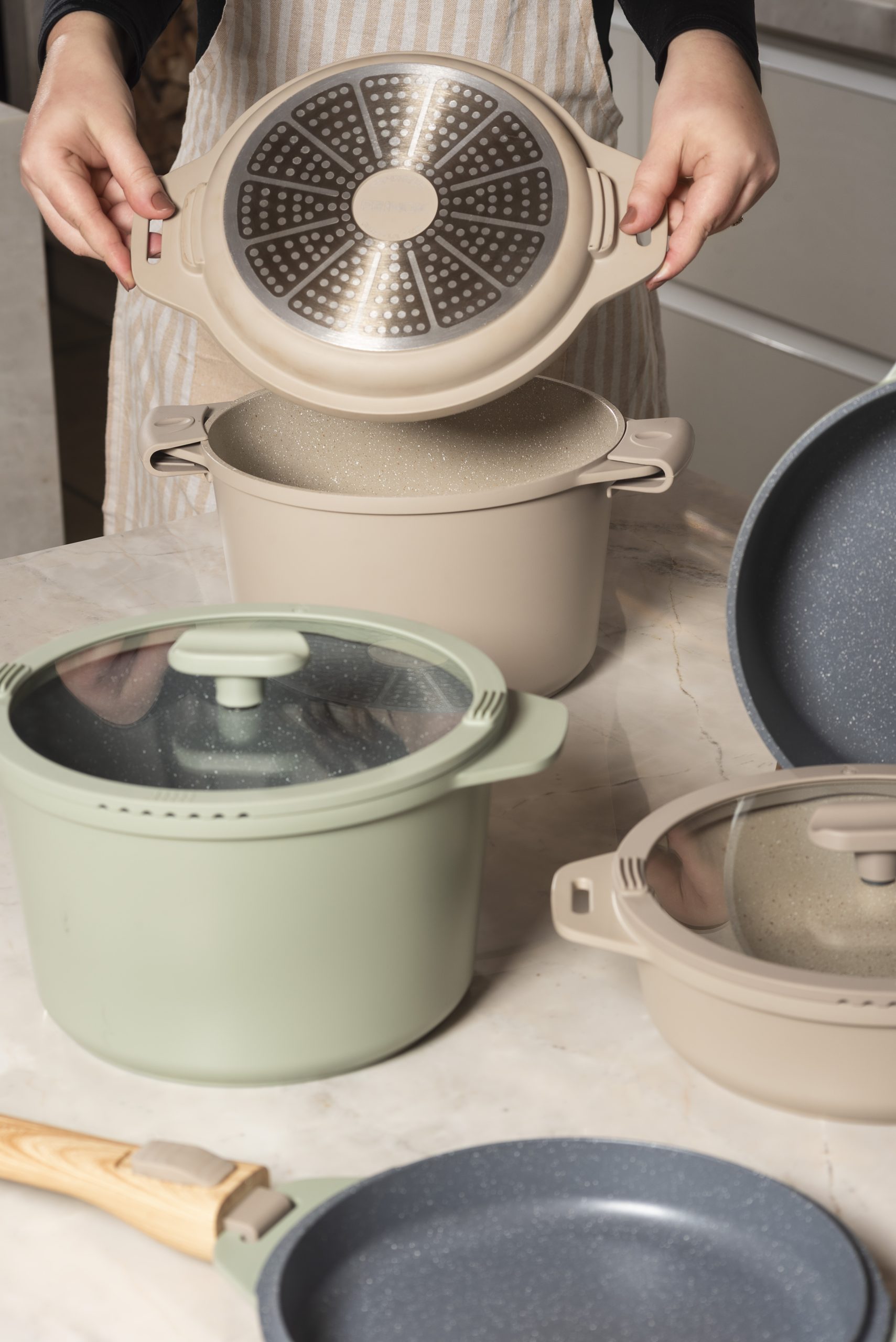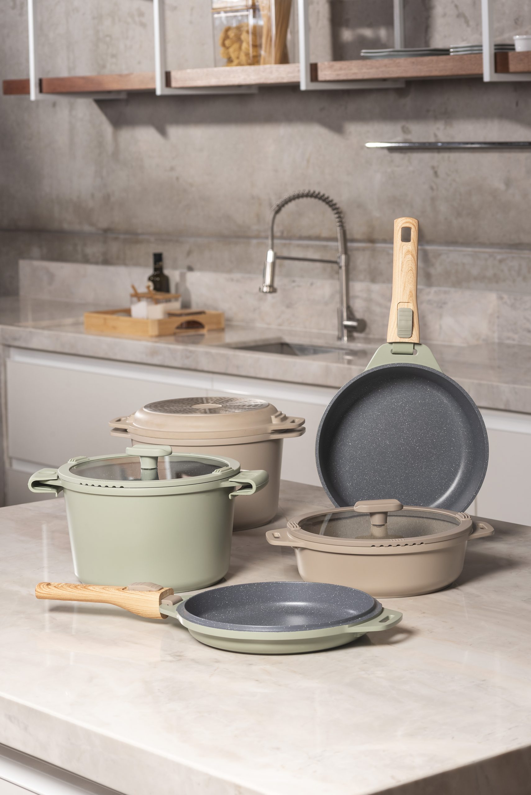 O Jogo de Panelas Empilhável Brinox Loft 7 Peças, da linha Ceramic Life, une design moderno, tecnologia e praticidade para o dia a dia. Disponível nas cores verde e areia, traz acabamento sofisticado e cabos com toque amadeirado, valorizando a estética da cozinha.