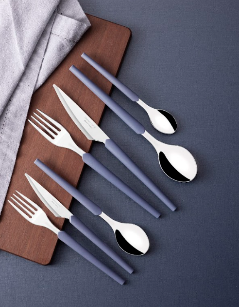 A linha Obelline acompanha a valorização da mesa posta como experiência, com talheres de perfil fino e alongado nas cores preto, vermelho rubi e azul boreal, que podem ser alinhados a itens de traços suaves e a um estilo de servir mais sofisticado. Estão disponíveis em jogos de 24 e 42 peças.