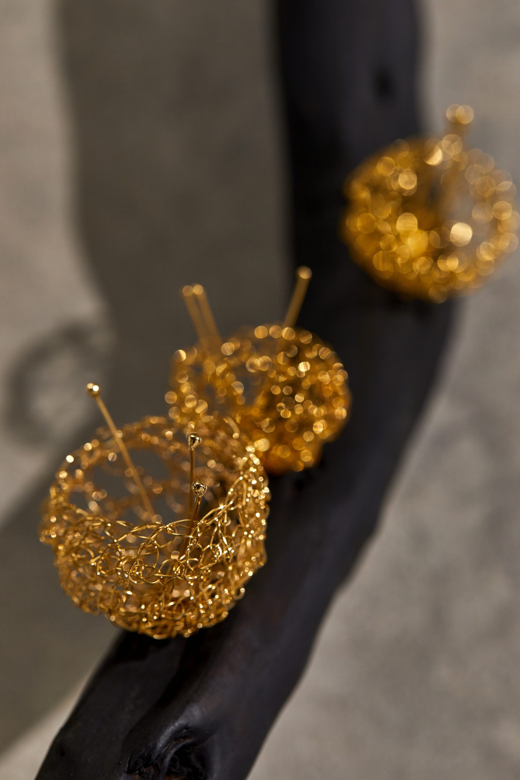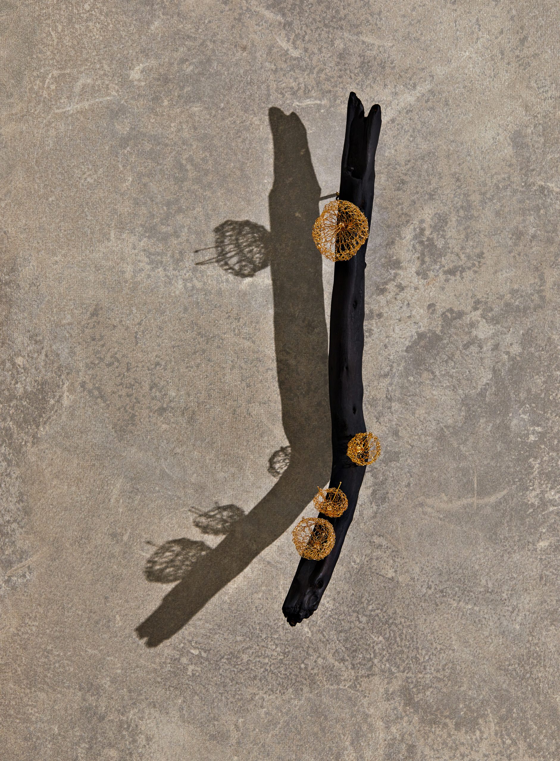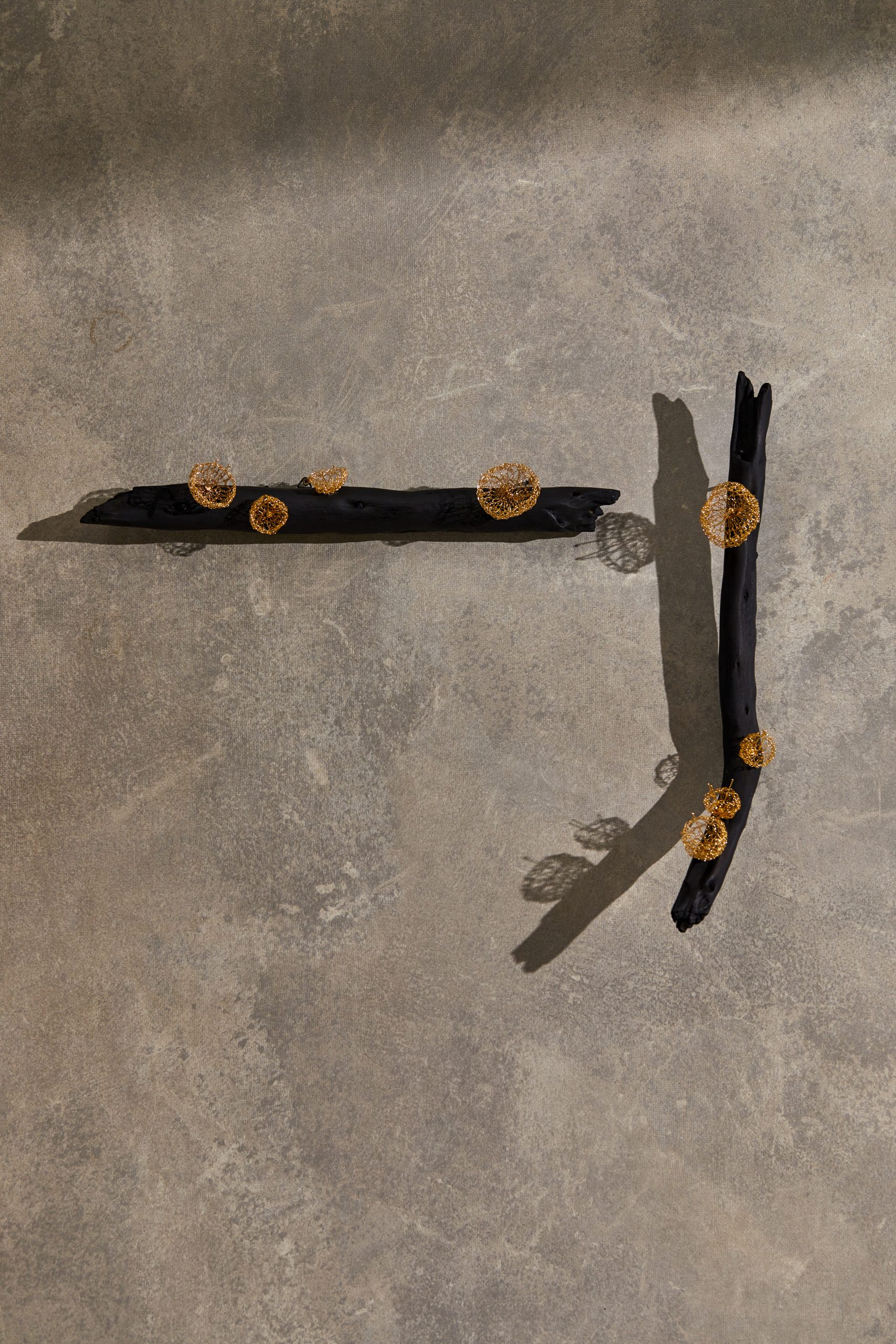 Flores crochetadas em fio de metal com banho de ouro adornam os galhos carbonizados por shou sugi ban, técnica tradicional japonesa. Objetos simbólicos e decorativos que unem a matéria bruta à delicadeza das formas construídas à mão.