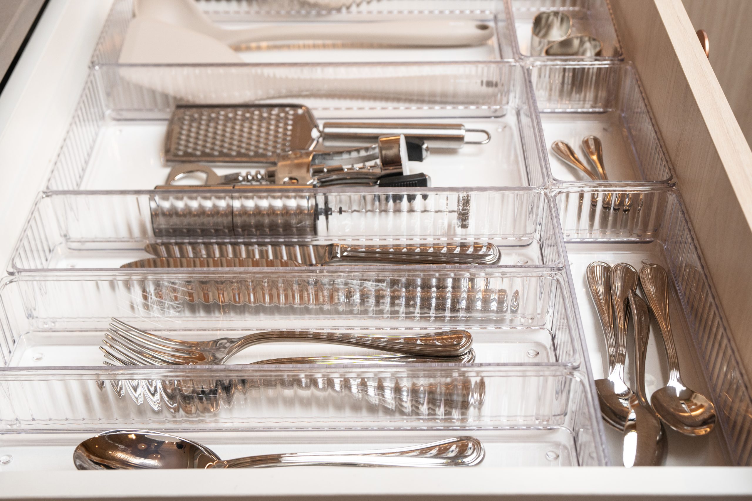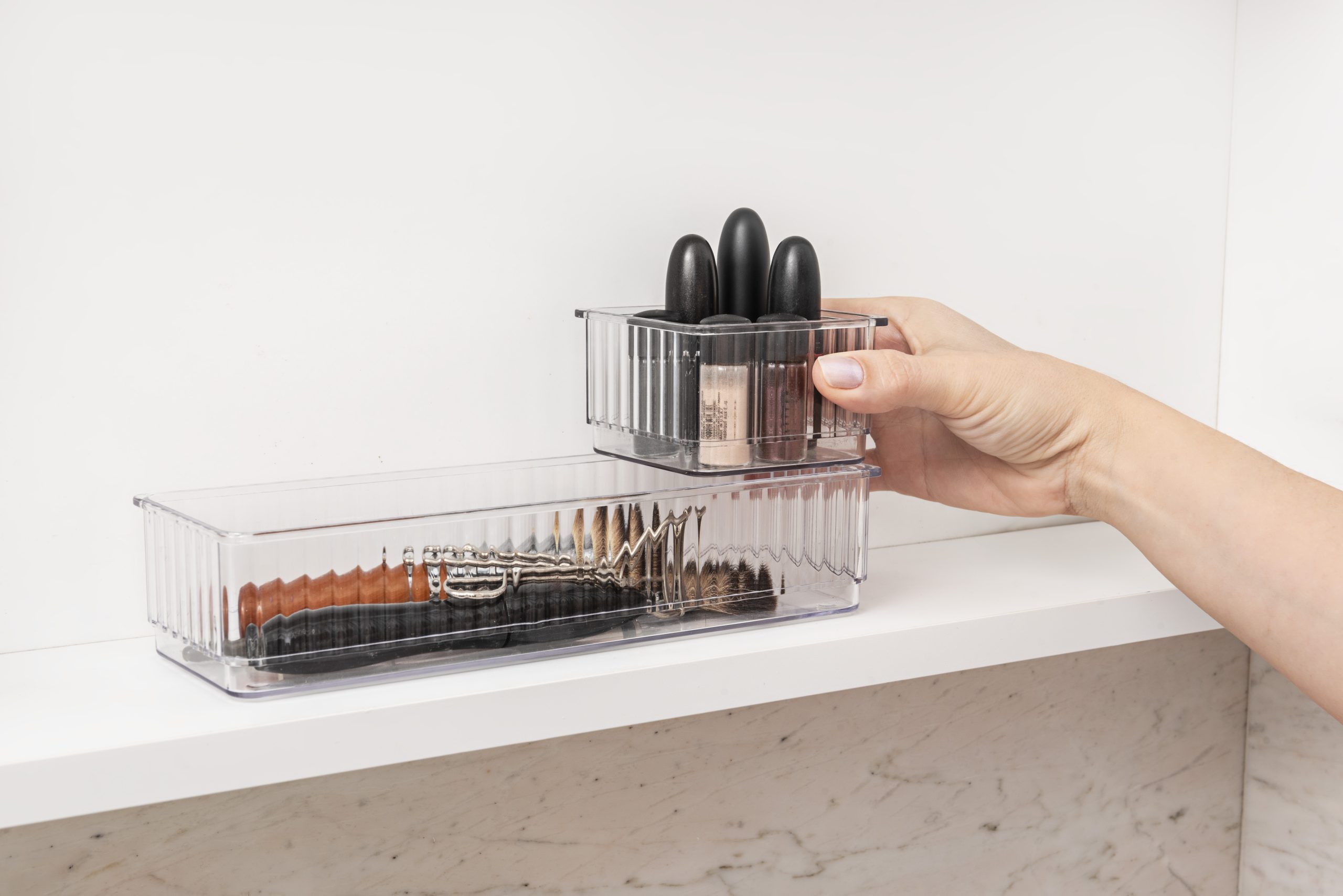 Organizadores modulares que se encaixam perfeitamente entre si, possibilitando composições personalizadas. A textura canelada agrega valor decorativo, enquanto a transparência facilita a visualização dos itens armazenados.