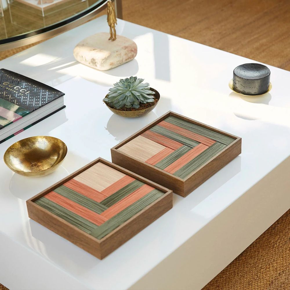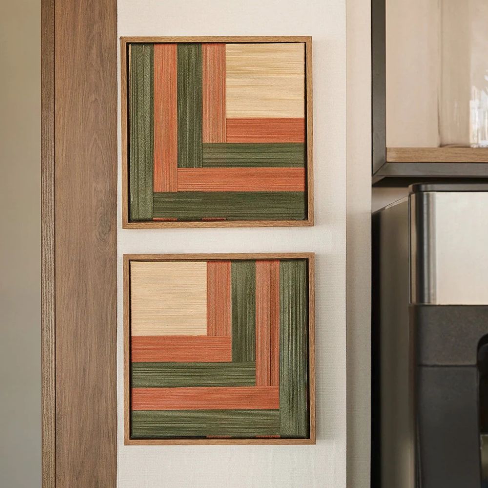 O Quadro Planos Goiaba é onde técnica e sensibilidade se encontram. Com padronagens lineares sobrepostas, feitas à mão com fios de algodão, ele traz uma superfície rica em textura, movimento e profundidade.