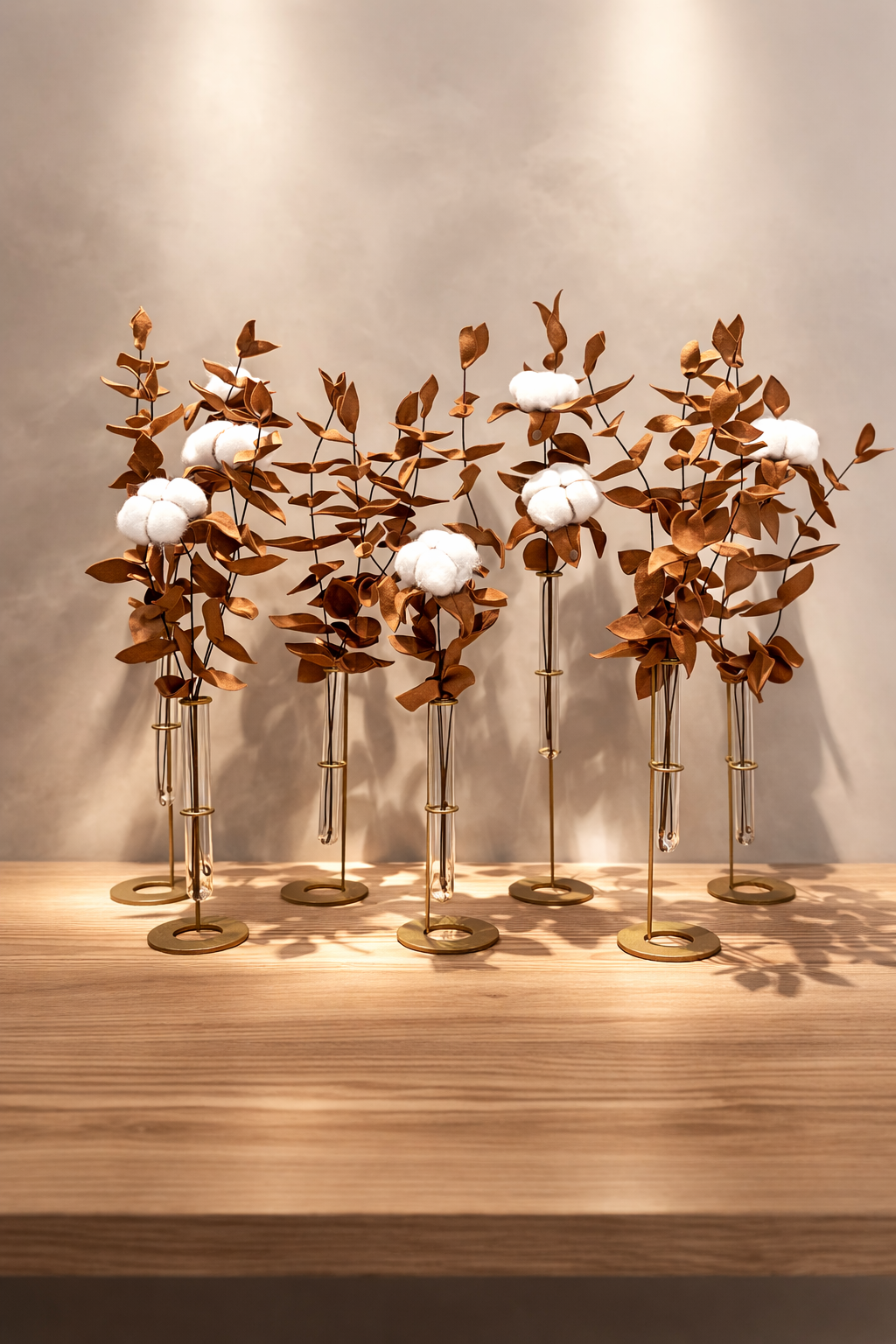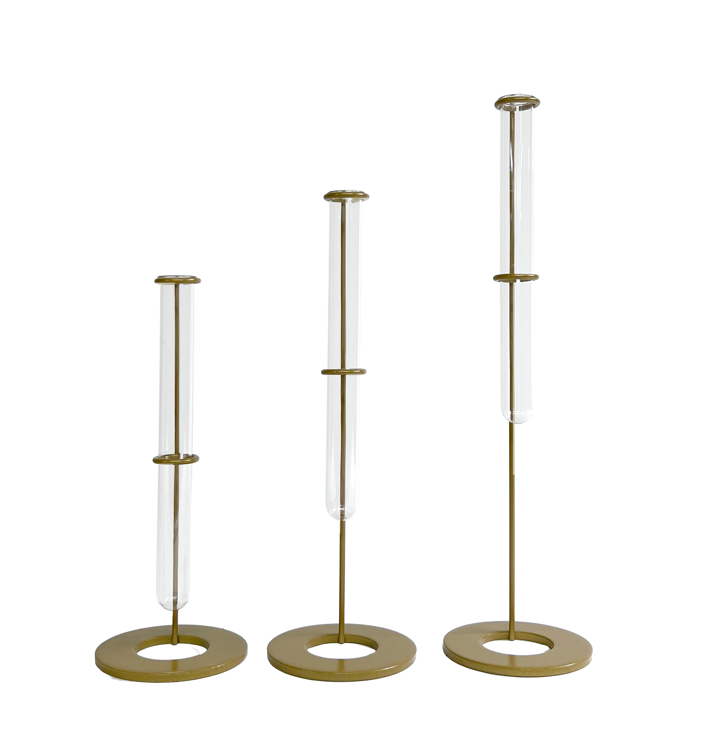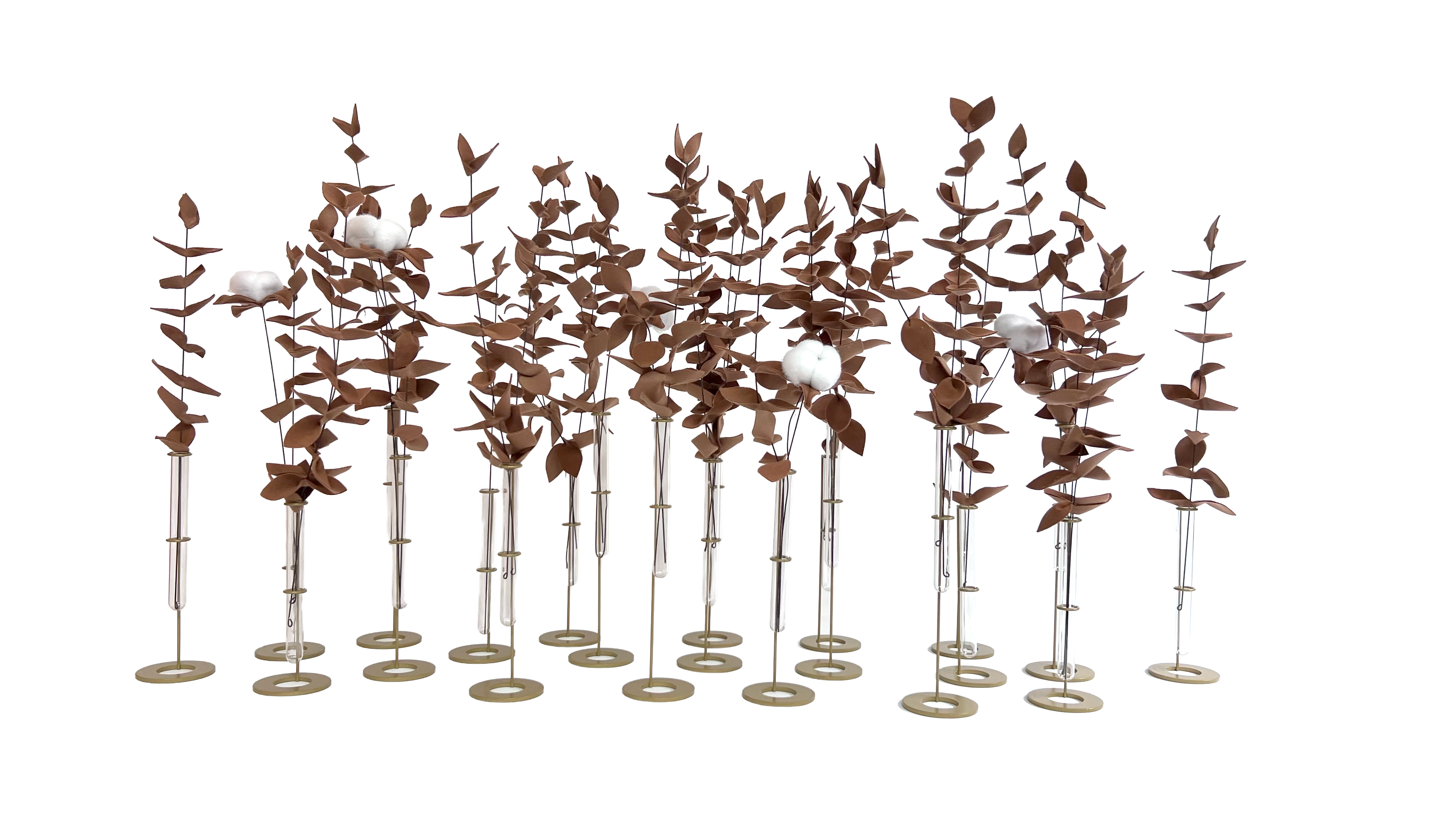 Vidro, metal e equilíbrio. Um suporte de inspiração quase científica que sustenta a composição botânica com precisão e leveza. Funciona como base silenciosa para flores e hastes têxteis, valorizando gesto, matéria e luz. Ideal como centro de mesa, em aparadores ou buffets.