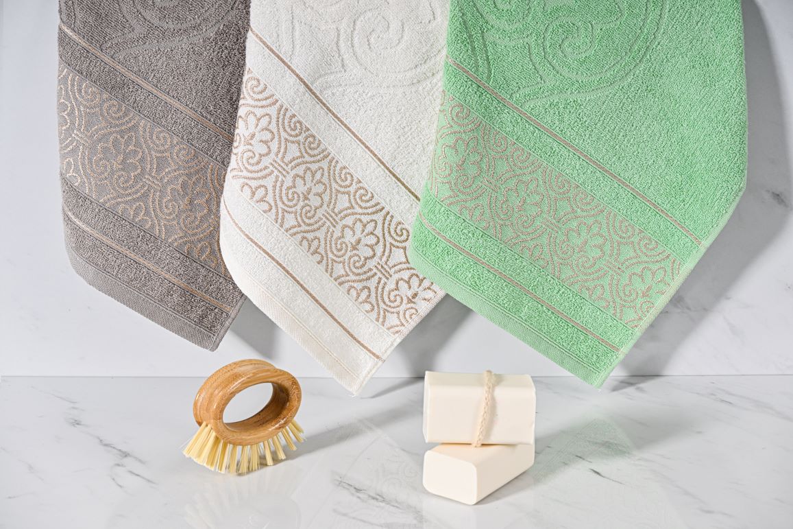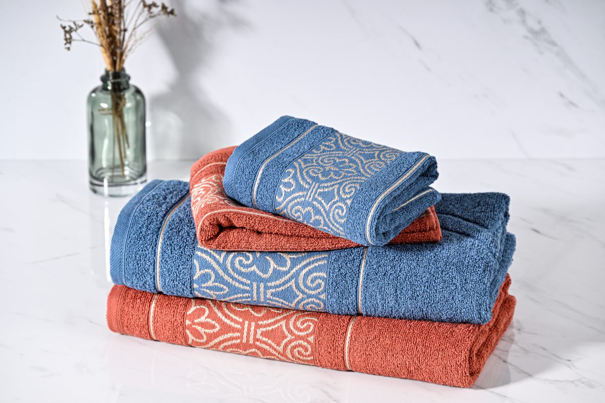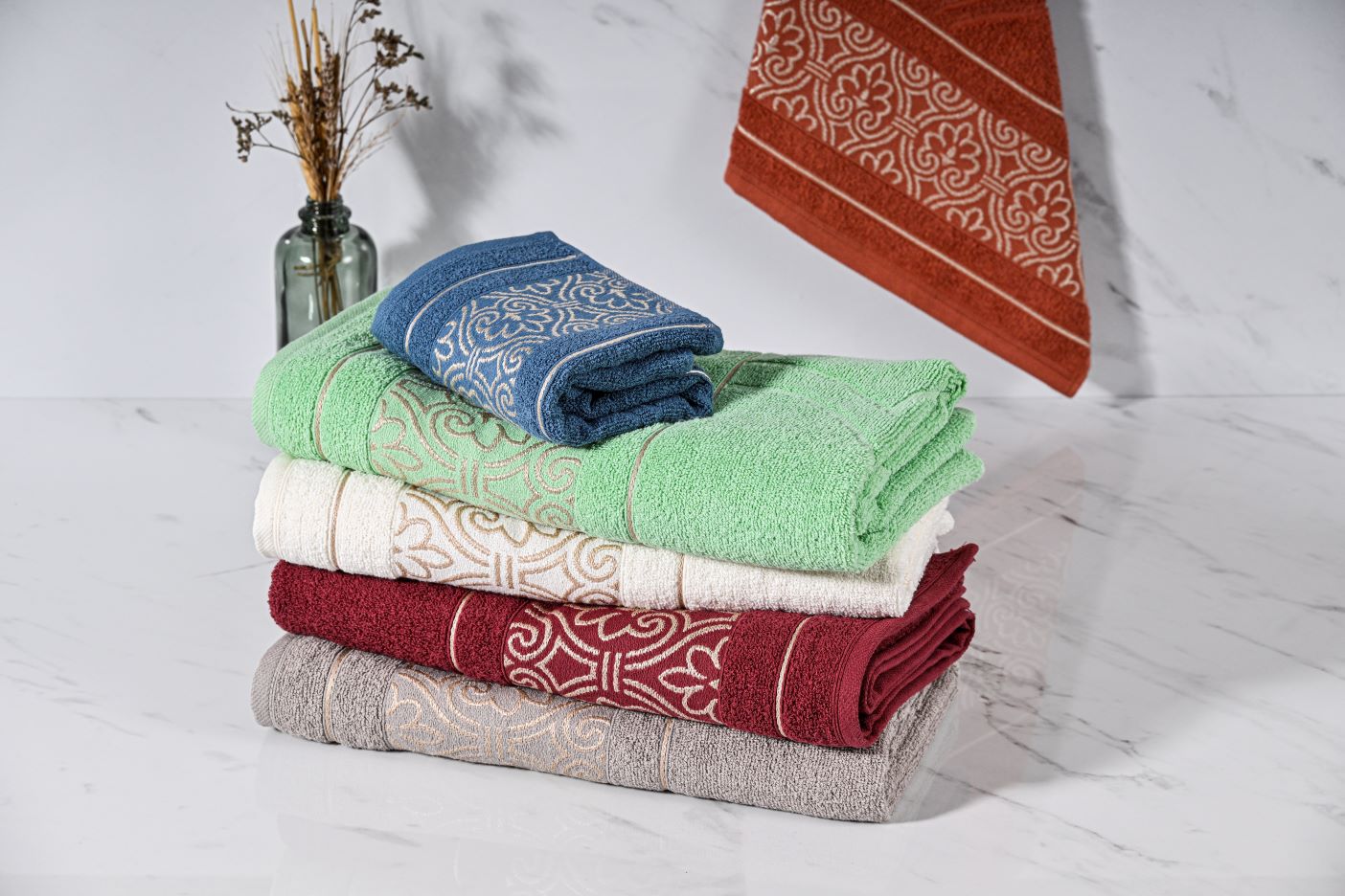 Ela é produzida com fio 100% algodão convencional de dupla torção, proporcionando melhor absorvência e suavidade. Seu corpo e barrado possuem lindos desenhos arabescos em fio metalizado dourado.
