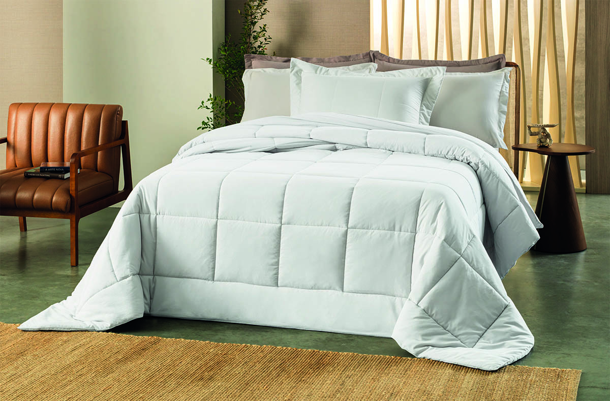 O Edredom Soufflé Branco, lançamento que une toque sedoso, secagem rápida e praticidade ao não amassar. Com enchimento de 250g de fibra ultra fina que oferece aquecimento na medida certa e volume elegante, garantindo bem-estar o ano todo. Compacto e versátil, coordena facilmente com a coleção e acompanha você em qualquer ambiente com conforto e leveza.