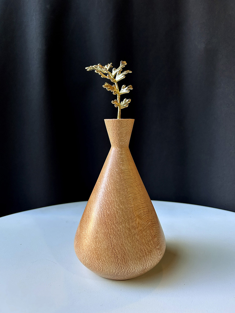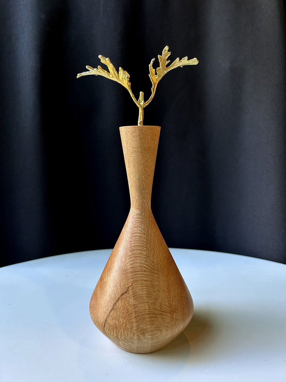 Vasinhos decorativos em madeira grevilha e metal bronze fundido banhado a ouro.