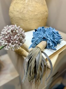 Colar PP cerrado con retales de cuero estilo gamuza en color azul con puntera de cerámica de alta temperatura y flecos de cuero en color gris.