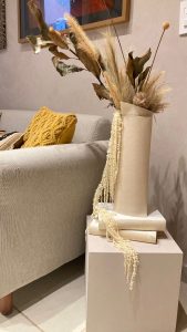 Vaso virada em couro na cor off-white com vaso de vidro reciclado para acomodar arranjos florais.