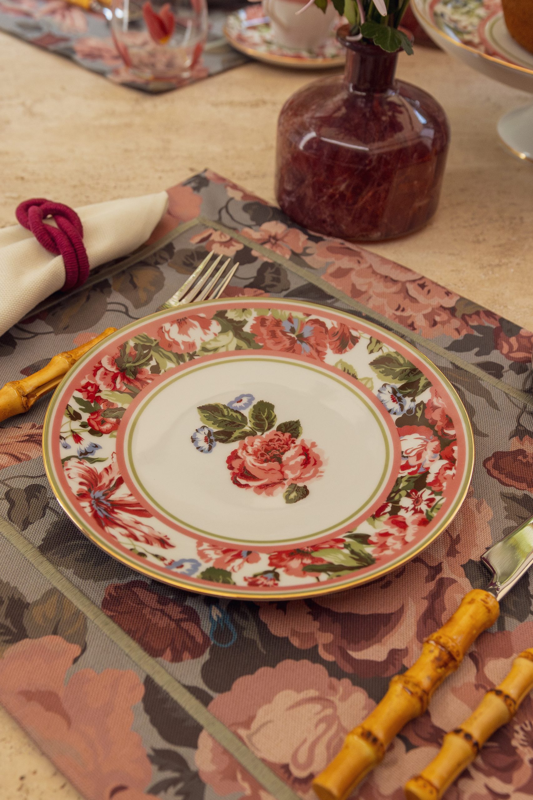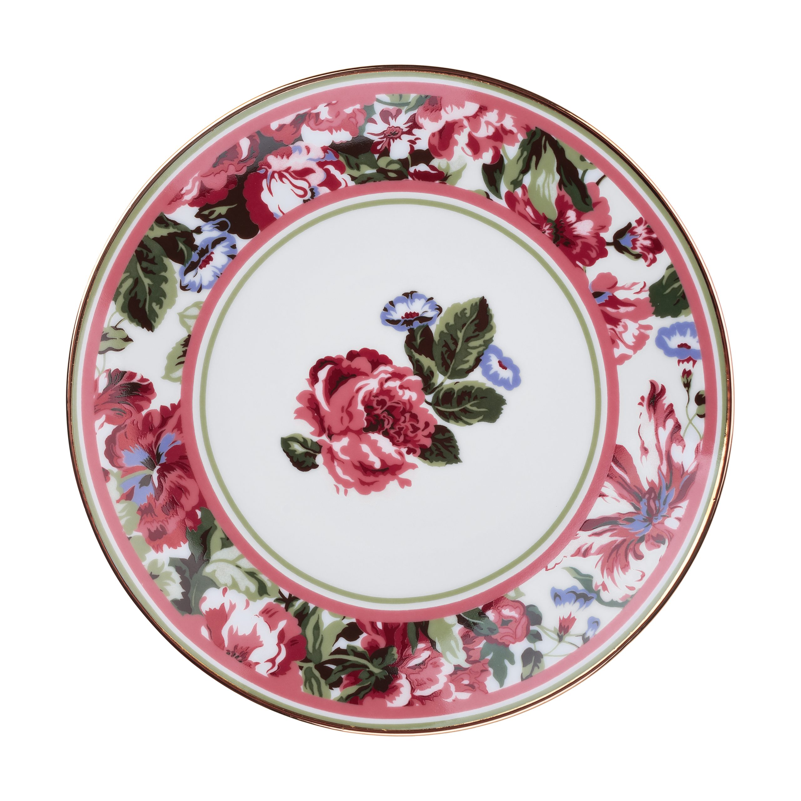 Prato sobremesa branco com com borda estampada em tema floral rosa e verde, flor ao centro e filete de ouro.