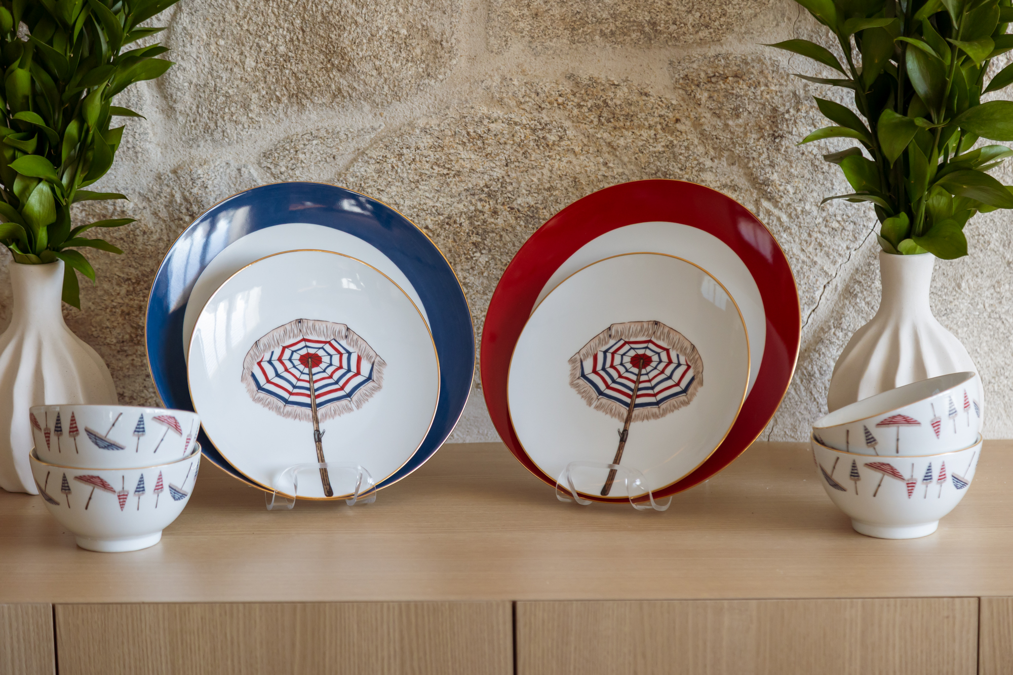 Prato raso branco com borda decalque na cor vermelho e filete de ouro .